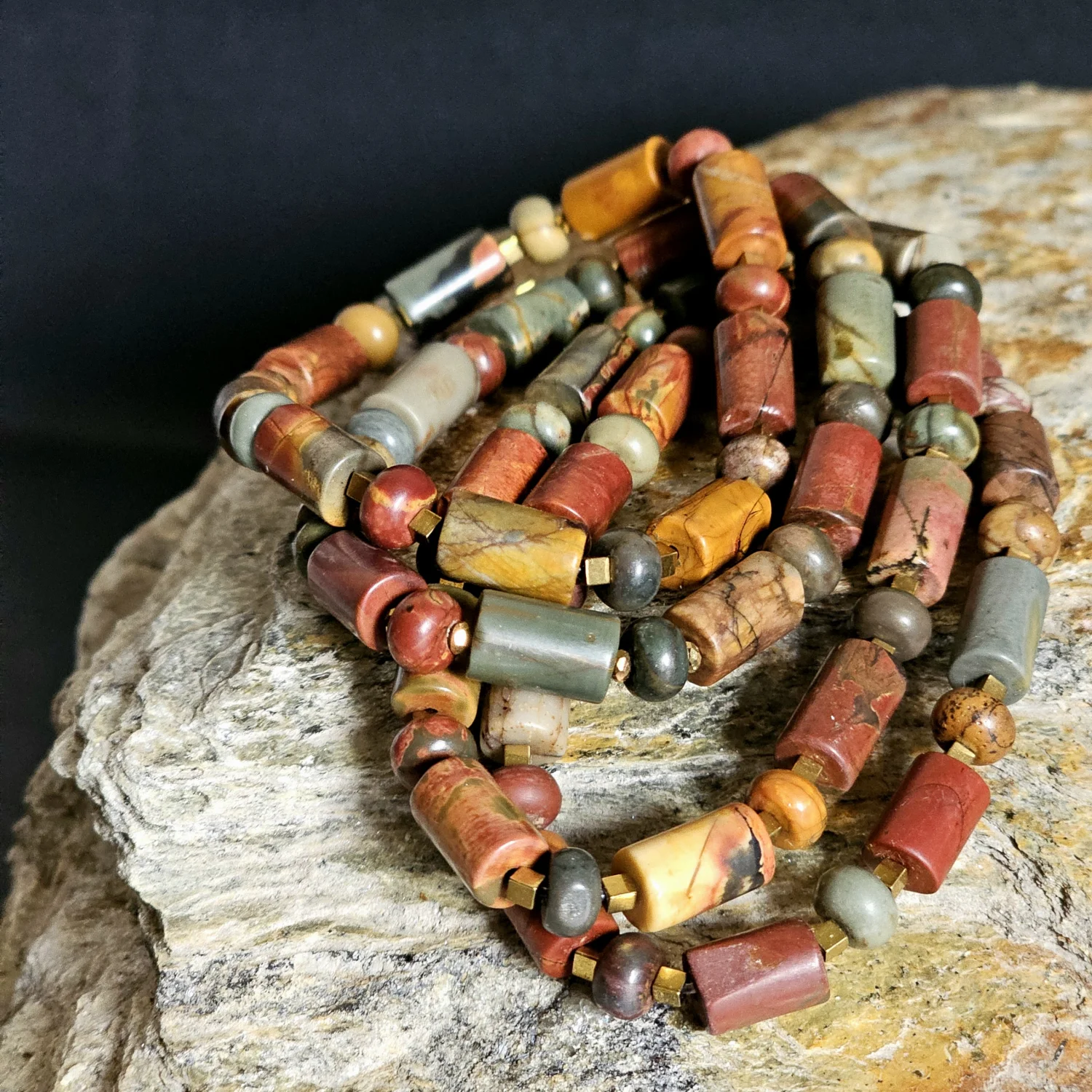 Bransoletka "Autumn Leaf" to piękny ręcznie robiony dodatek, inspirowany kolorami jesieni. Wykonana z jaspisów w kształcie walców, o wymiarach 5 mm średnicy i 10 mm długości, zachwyca harmonijną paletą barw – odcienie czerwieni, zieleni, żółci idealnie oddają klimat jesieni. Między jaspisowymi walcami wplecione są małe kostki hematytu w kolorze brązowego złota, które dodają całości elegancji i głębi.