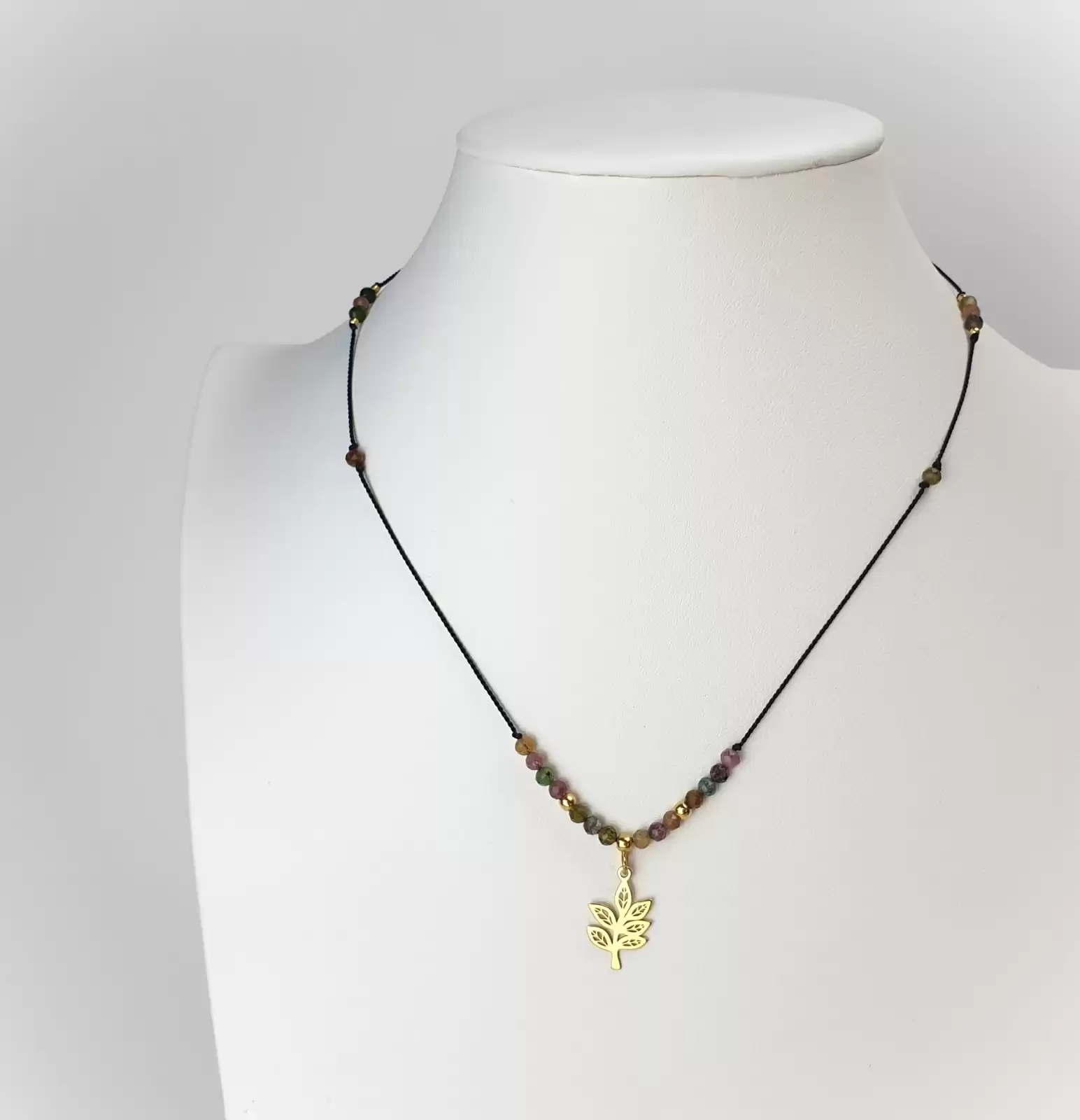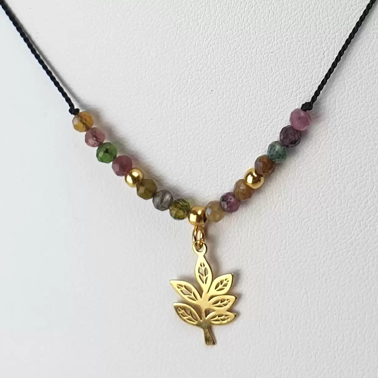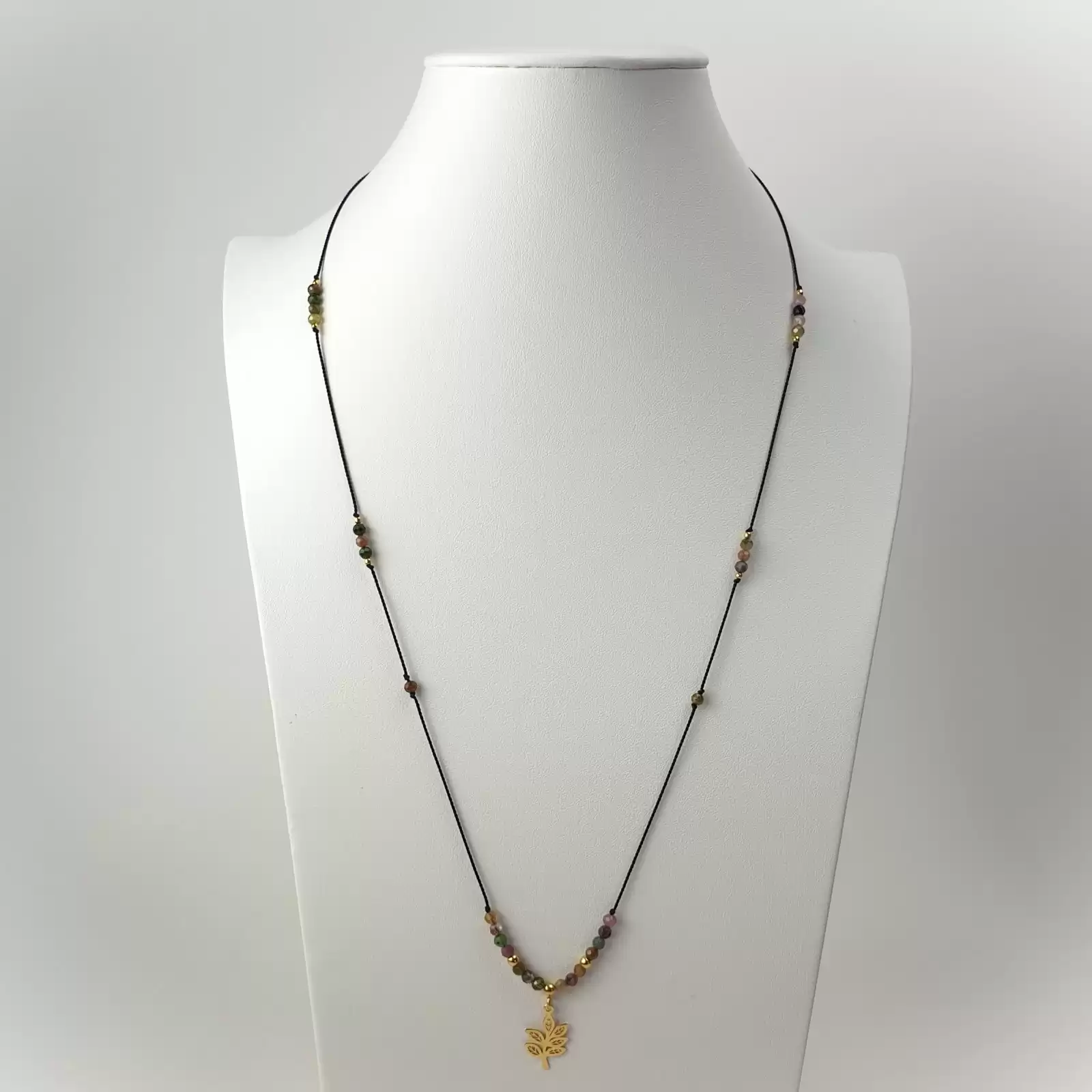 Delikatny oraz subtelny naszyjnik wykonany z KOLOROWEGO TURMALINU. Drobne 3mm okrągłe kamienie fasetowane nawleczone zostały na nić jedwabną w kolorze czarnym. W środkowej części króluje złocona zawieszka w kształcie gałązki z liścmi. Naszyjnik jest regulowany za pomocą kuleczki ze srebra próby 925 złoconego 24k. złotem. Można nosić go przy szyi lub opuścić nisko, aż po dekolt :) Im bardziej skrócimy naszyjnik, tym dłuższe będą odcinki nici jedwabnej na plecach. Jako, że są zakończone kamieniami oraz srebrem złoconym stanowią piękną ozdobę w szczególności w kreacjach z odsłoniętymi plecami. Ze względu na możliwość regulacji może być noszony z innymi łańcuszkami, kaskadowo. Dzięki uniwersalnemu rozmiarowi jest też wspaniałym wyborem na prezent.