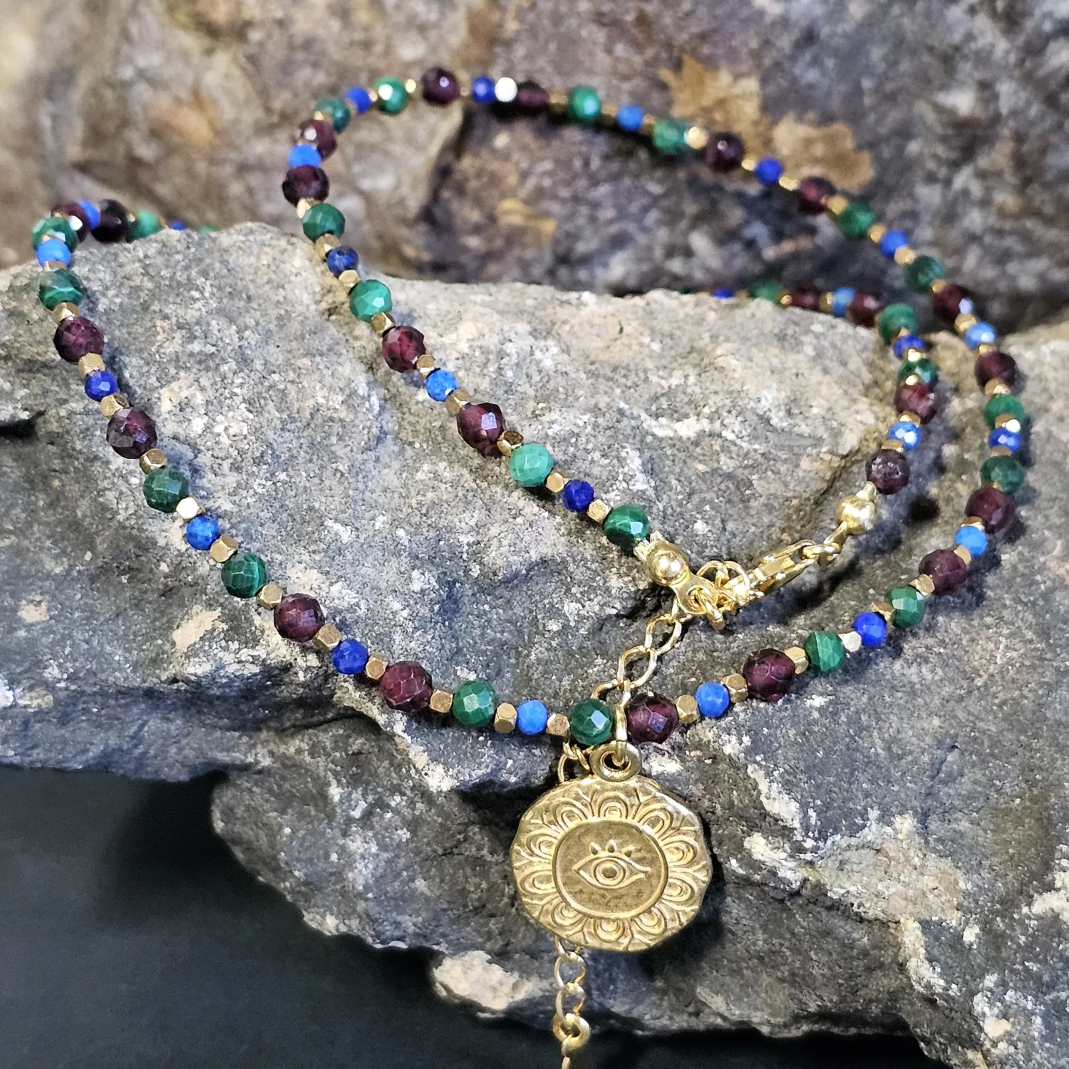 Maleńkie, fasetowane 2mm kuleczki lapis lazuli oraz drobne złote hematyty tańczą w promieniach światła, ujawniając ich naturalne piękno i magię. Malachit o średnicy 3mm z jego hipnotyzującymi zielonymi pasmami, przynosi harmonię i równowagę, podczas gdy fasetowany 3mm granat, iskrzący rubinowymi refleksami, dodaje energii i pasji. To połączenie kamieni szlachetnych tworzy niezwykłą symfonię kolorów i tekstur, która zachwyca i inspiruje.