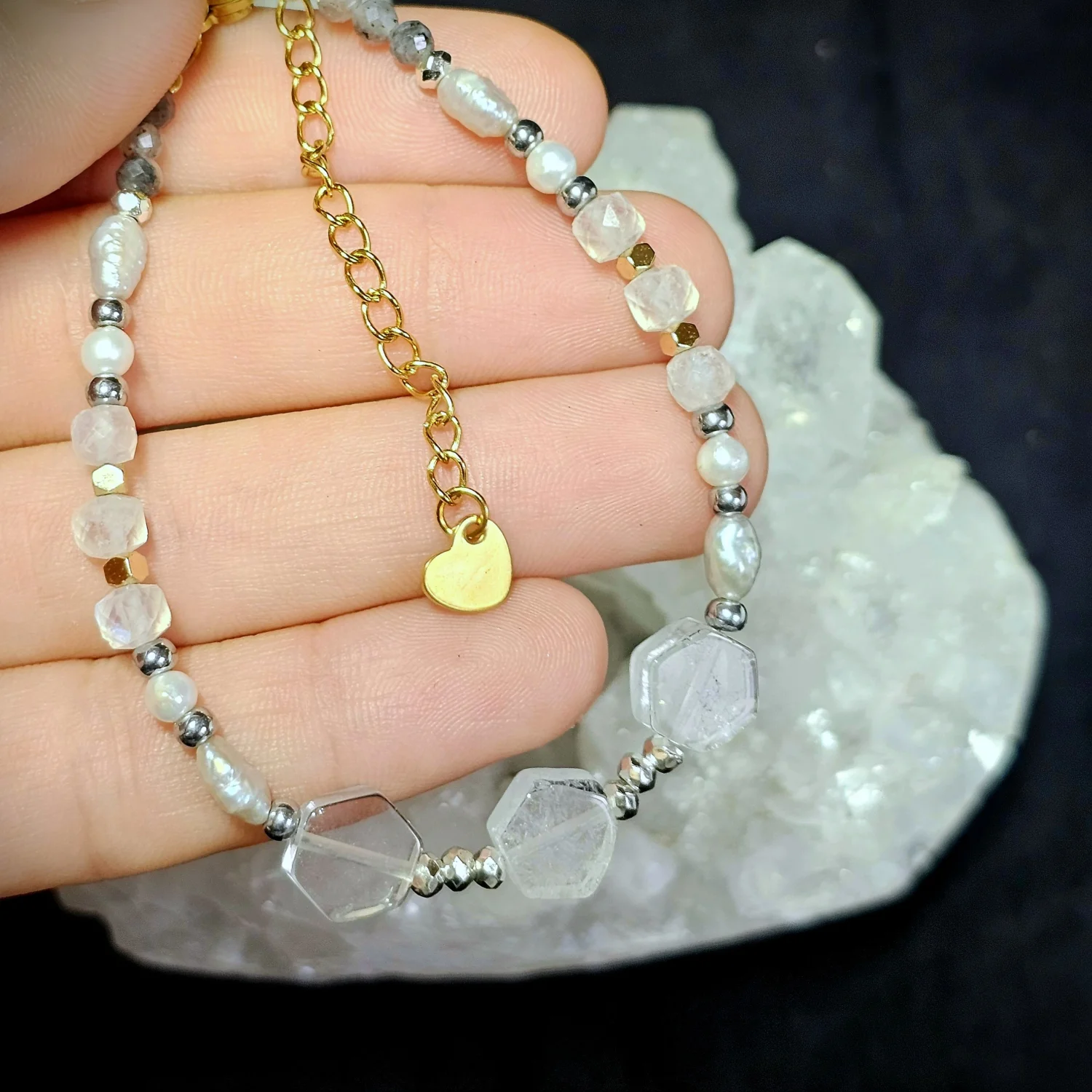 To bransoletka, która łączy przejrzystość kryształu, klasykę pereł i subtelny blask minerałów. Idealna dla nowoczesnej kobiety, która ceni biżuterię oryginalną, pełną detali i dopracowaną w każdym szczególe.