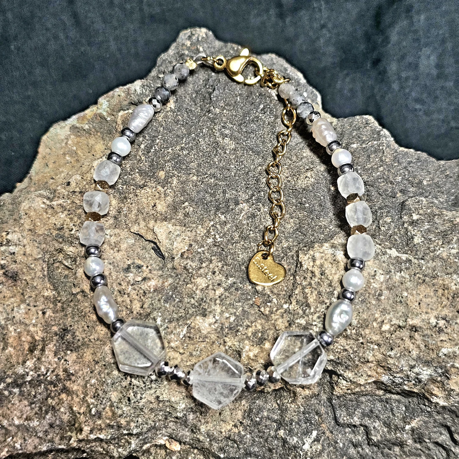 Ta wyjątkowa bransoletka zachwyca starannie dobraną kompozycją naturalnych kamieni i pereł, połączonych z subtelnym blaskiem hematytów. Całość utrzymana w eleganckiej tonacji bieli, szarości i złotych refleksów, łączy w sobie klasykę i nowoczesność.
