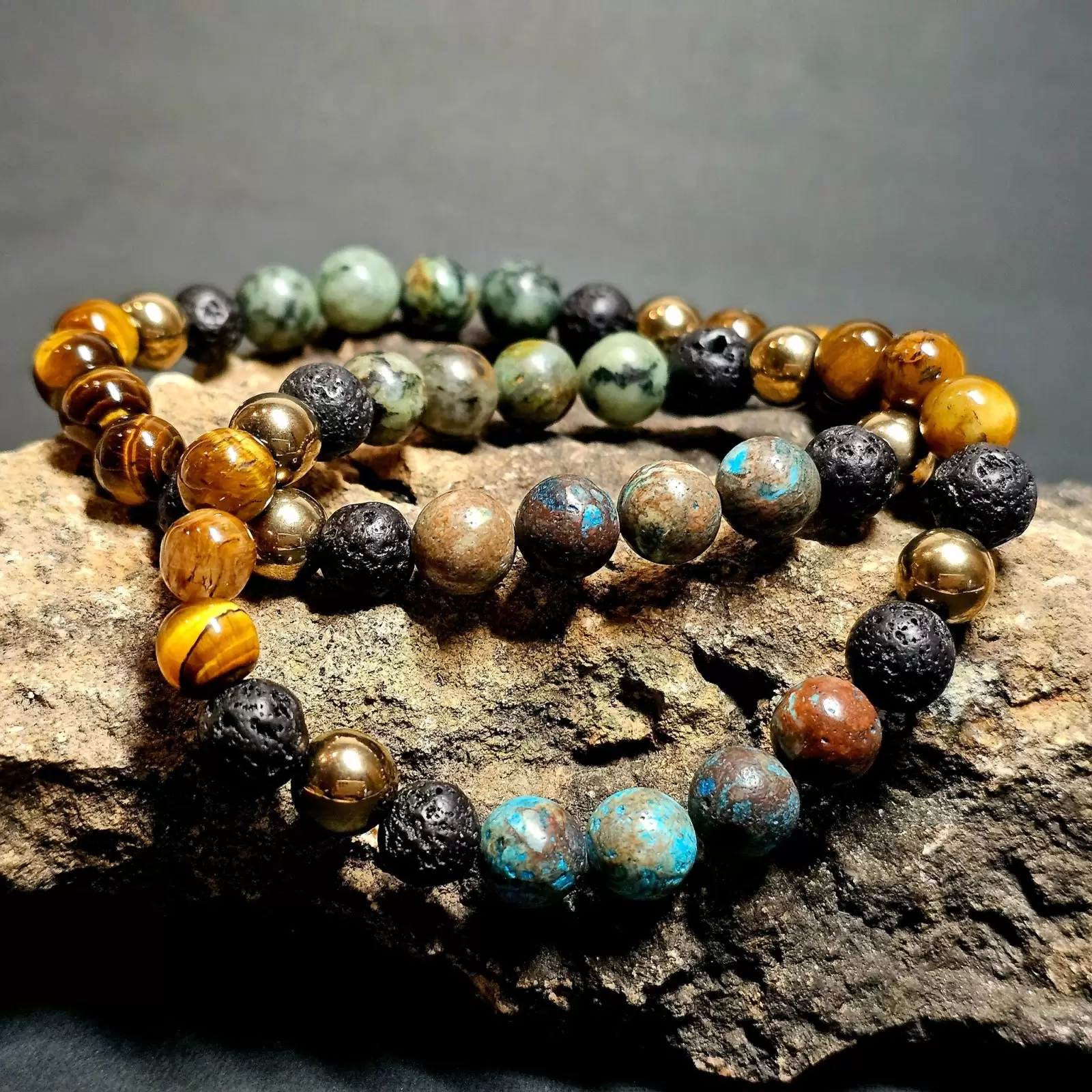 Ta spektakularna bransoletka została zaprojektowana z myślą o osobach pragnących podkreślić swój styl i osobowość lub po prostu chcących dopełnić outfit ciekawym naturalnym dodatkiem. Powstała z 8mm kul lawy, jaspisu niebieskiego, turkusu afrykańskiego oraz tygrysiego oka i hematytu platerowanego. Kamienie są nawleczone na gumkę jubilerską co sprawia, że jest wygodna w użytkowaniu na co dzień :)