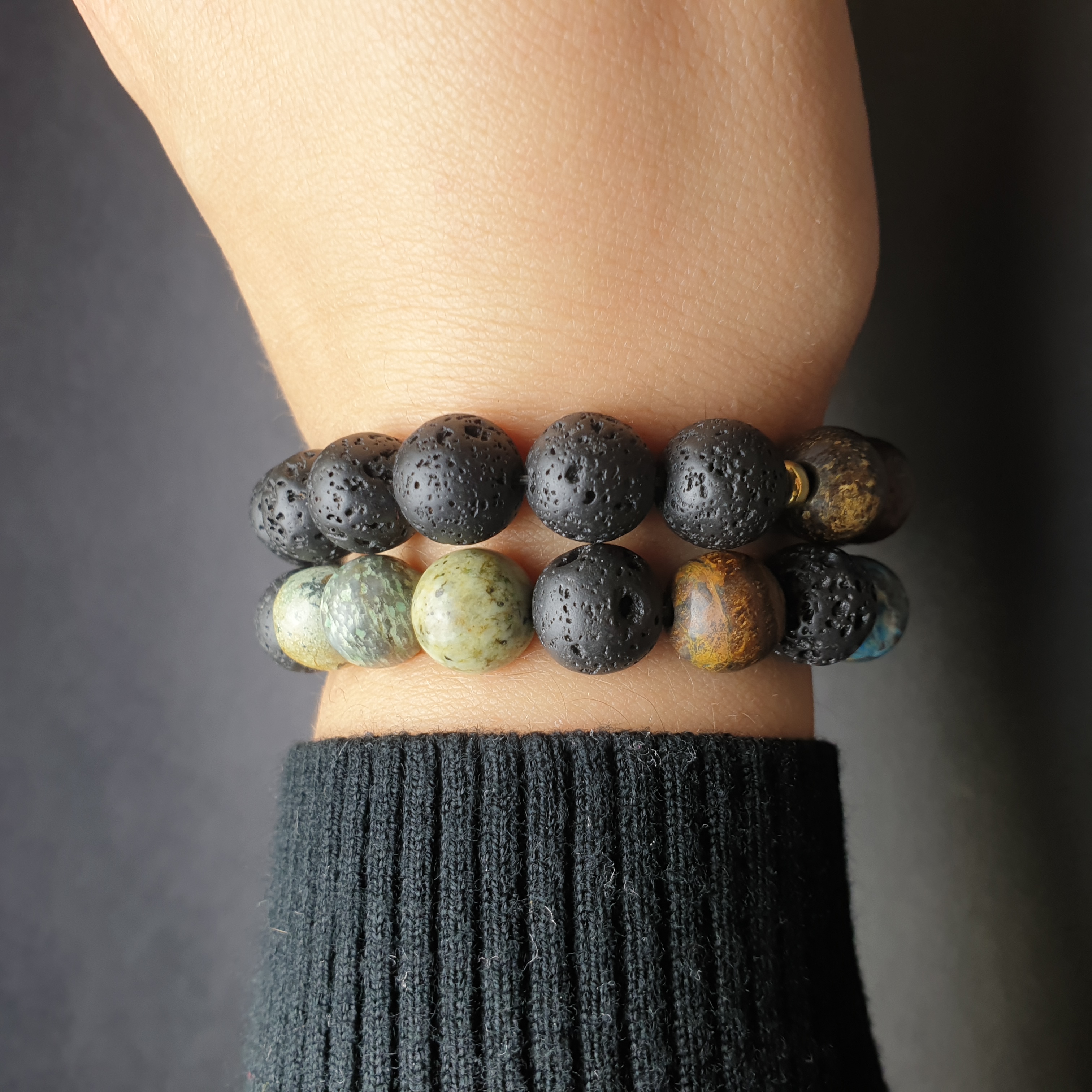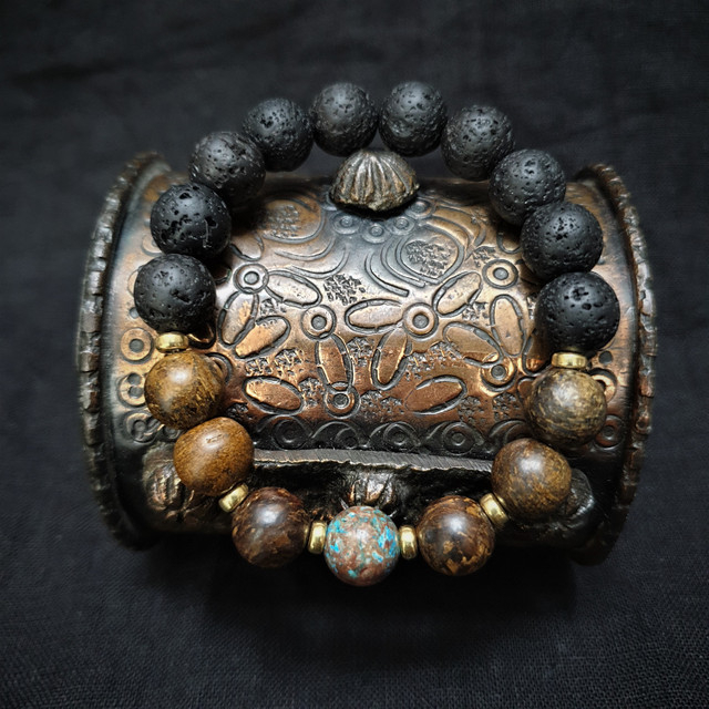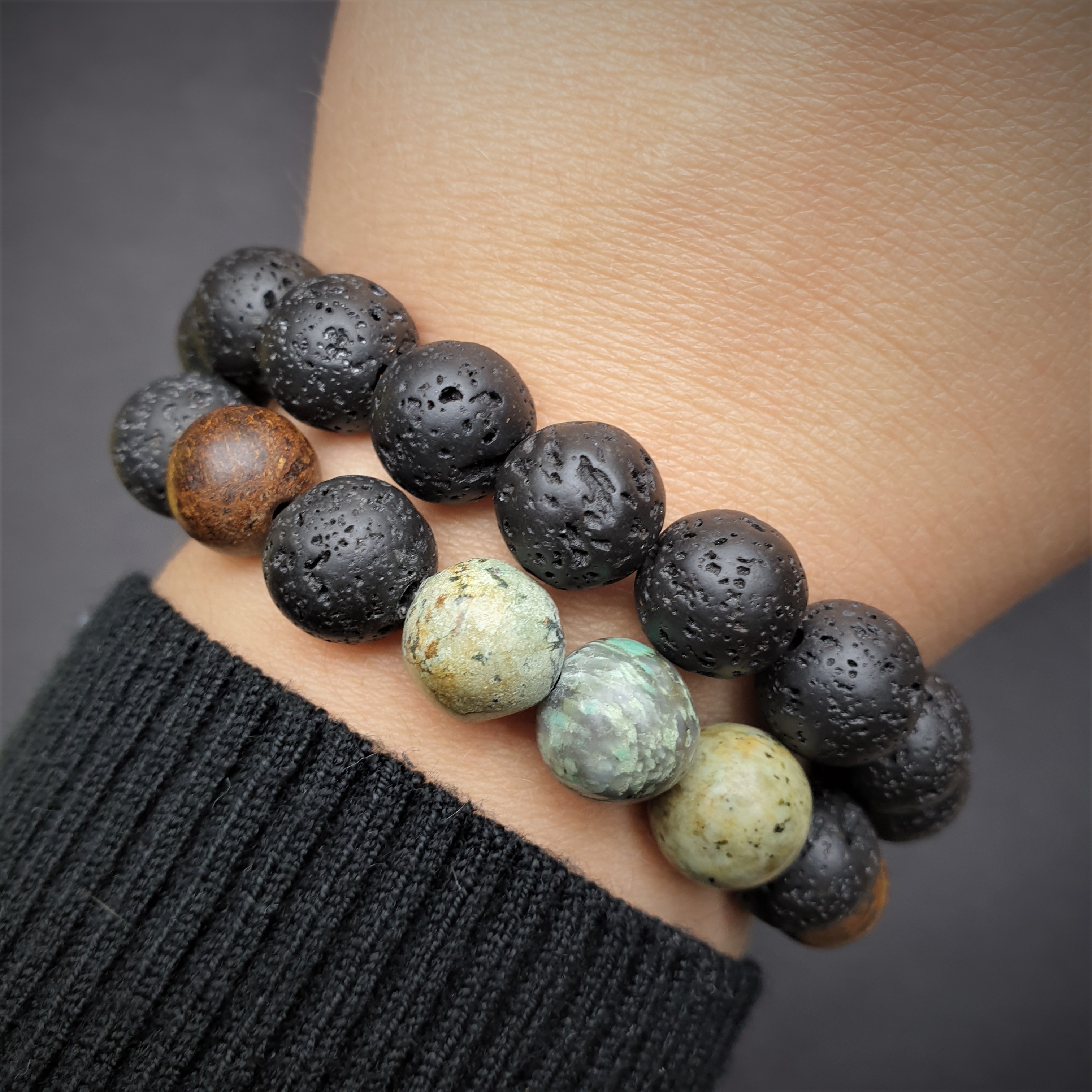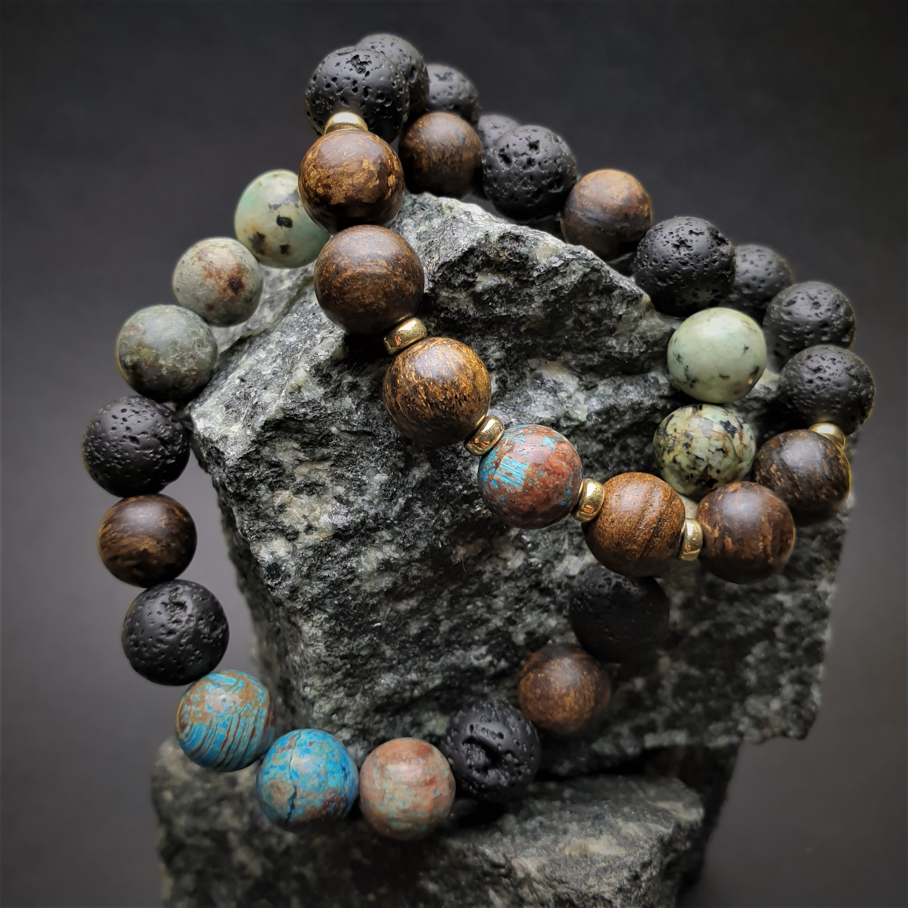Ta wyjątkowa bransoletka została wykonana z kamieni naturalnych o średnicy 10mm na elastycznej gumce jubilerskiej. O jej unikatowości stanowi niesztampowy, autorski układ elementów i harmonijne zestawienie kolorów. JASPIS jest jednym z bardziej cenionych kamieni w jubilerstwie. W „bransoletce” 3 kule jaspisu umieszczone są centralnie. Jego niebieska barwa przyciąga wzrok a brązowe plamki harmonijnie nawiązują do nieopodal sąsiadujących z nim kul bronzytu. BRONZYT jest stosunkowo twardym minerałem. Nawet w matowej wersji kuli w promieniach słońca mieni się kolorami antycznego złota, orzecha i gorzkiej czekolady. TURKUS AFRYKAŃSKI cechuje piękna zielonkawa barwa i energia. Kule wykonane z tego minerału różnią się od siebie, ich kształt czasami przypomina bardziej geoidę niż idealną kulę. Liczne konkrecje, naloty i naskorupienia dodają bransoletce zawierającej turkus afrykański wyjątkowy charakter. Surowe piękno tego kamienia przyciąga osoby ceniące naturę i pierwotny urok nieprzetworzonych darów ziemi. W bransoletce „GIFT OF NATURE” LAWA WULKANICZNA kontrastuje z innymi kamieniami podbijając ich unikatowe wartości estetyczne. Sposób w jaki powstaje oraz jej pochodzenie sprawiły, że ludzie zaczęli przypisywać jej specjalne właściwości. Ponadto lawa dzięki swojej porowatej powierzchni doskonale chłonie różnego typu olejki eteryczne i może być wykorzystywana przy aromaterapii.