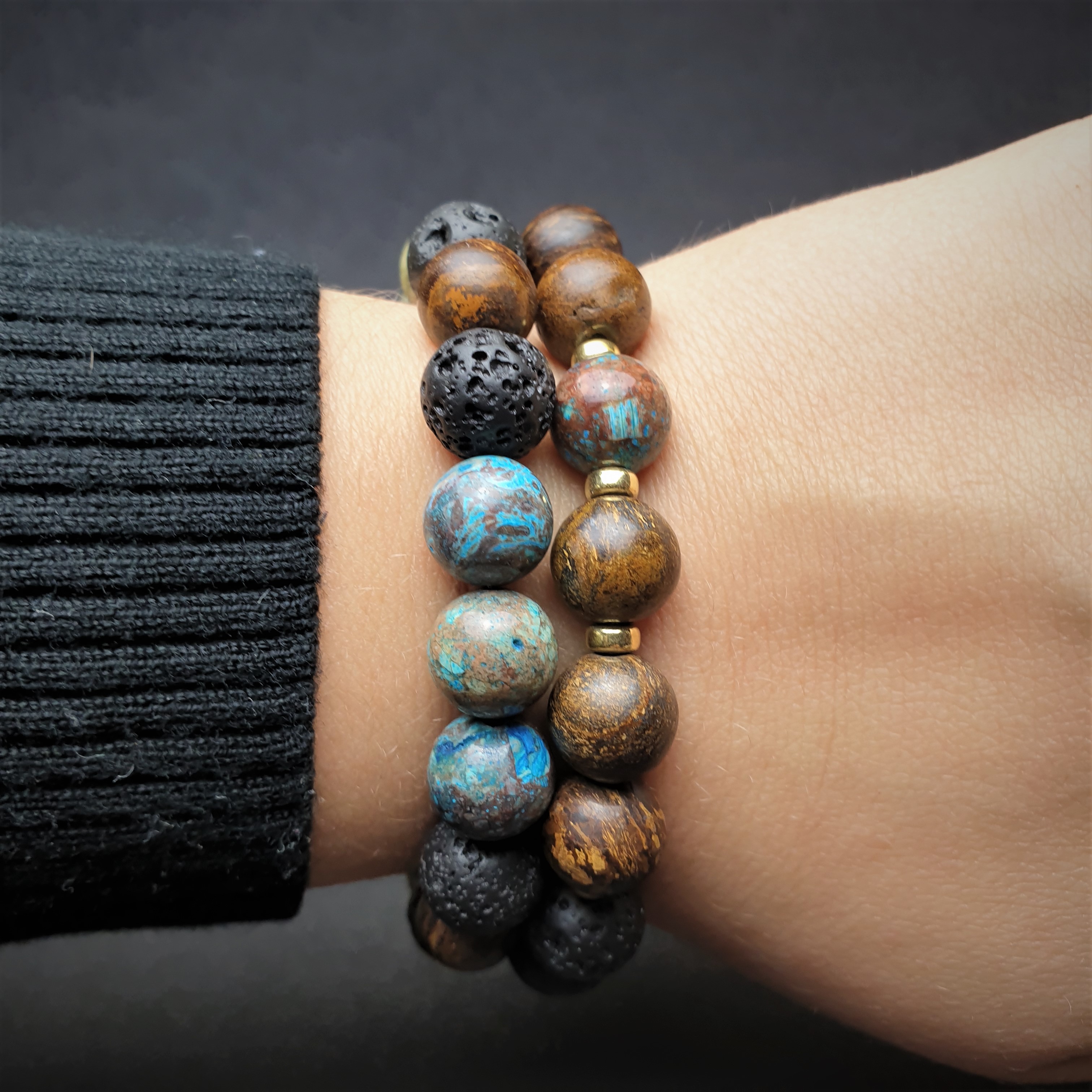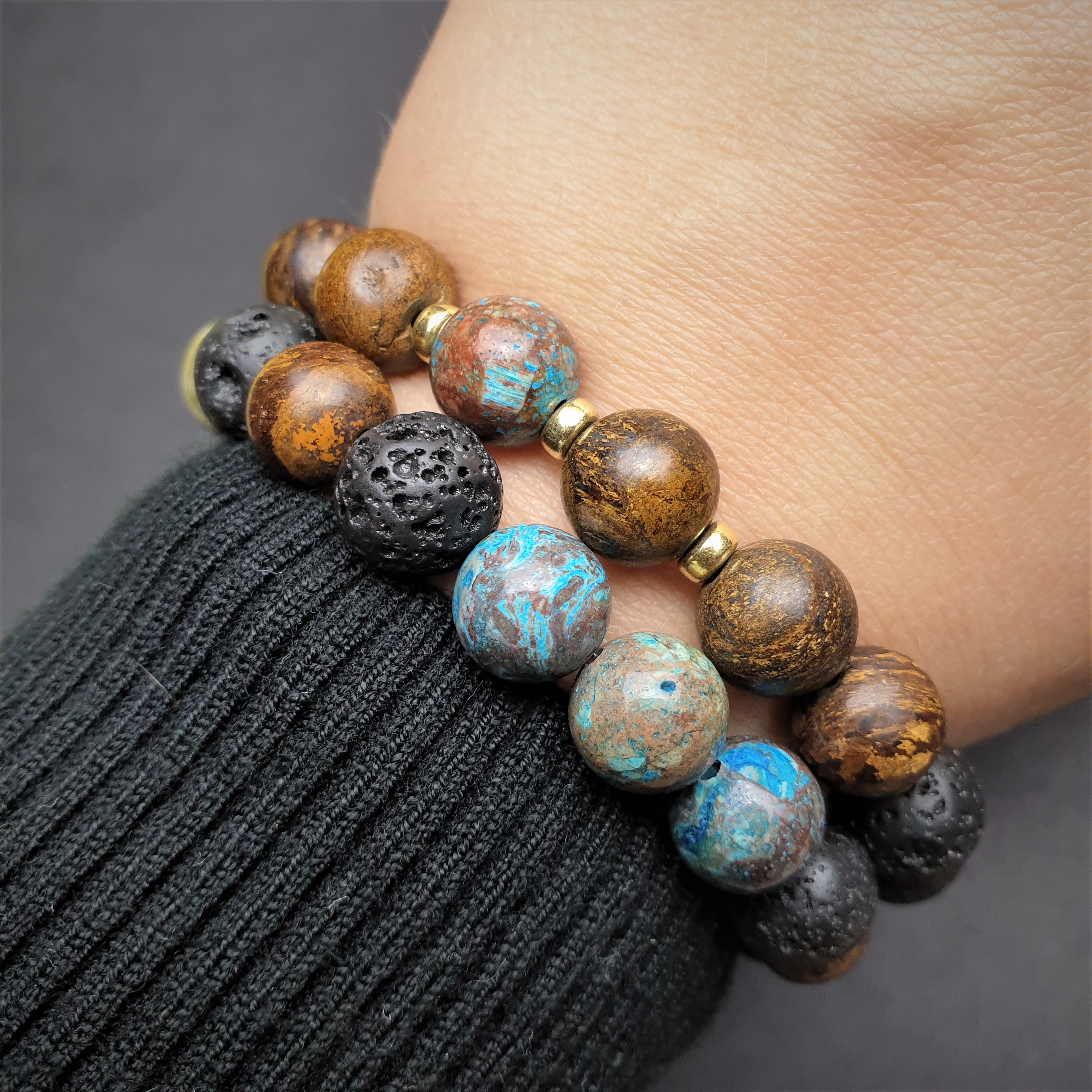 Ta wyjątkowa bransoletka została wykonana z kamieni naturalnych o średnicy 10mm oraz ze srebrnych przekładek pokrytych złotem na elastycznej gumce jubilerskiej. O jej unikatowości stanowi niesztampowy, autorski układ elementów i spójne zestawienie kolorów. Znaczną część bransoletki tworzy LAWA WULKANICZNA. Sposób w jaki powstaje oraz jej pochodzenie sprawiły, że ludzie zaczęli przypisywać jej specjalne właściwości. Ponadto lawa dzięki swojej porowatej powierzchni doskonale chłonie różnego typu olejki eteryczne i może być wykorzystywana przy aromaterapii. BRONZYT jest stosunkowo twardym minerałem. Nawet w matowej wersji kuli w promieniach słońca mieni się kolorami antycznego złota, orzecha i gorzkiej czekolady. W zestawieniu ze złotymi przekładkami tworzy ponadczasową, szlachetną kompozycję. JASPIS NIEBIESKI jest jednym z bardziej cenionych kamieni w jubilerstwie. W „EARTHY VIBES” kula jaspisu umieszczona jest centralnie. Jego niebieska barwa przyciąga wzrok a brązowe plamki harmonijnie nawiązują do sąsiadujących z nim kul bronzytu