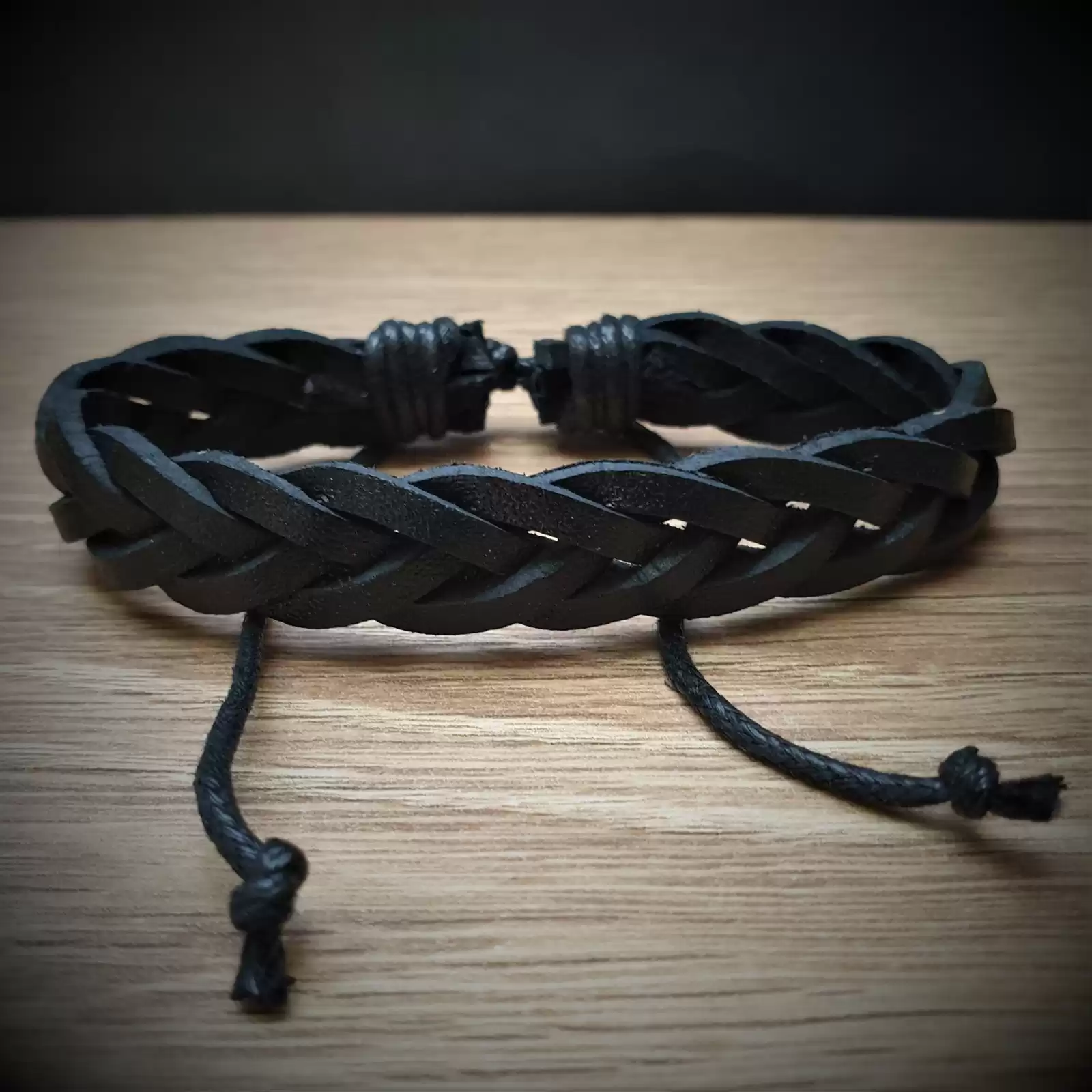 Skórzana bransoletka w kolorze czarnym z regulacją obwodu. Z pewnością pomoże uzewnętrznić styl i charakter swego właściciela. Będzie wyglądała wspaniale noszona solo jak i w zestawieniu z innymi bransoletkami. Będą do niej pasowały te ze skóry jak i drewna czy kamieni naturalnych. Pasuje na nadgarstek o rozmiarze/obwodzie: od M (16cm) do XXXL(20cm).