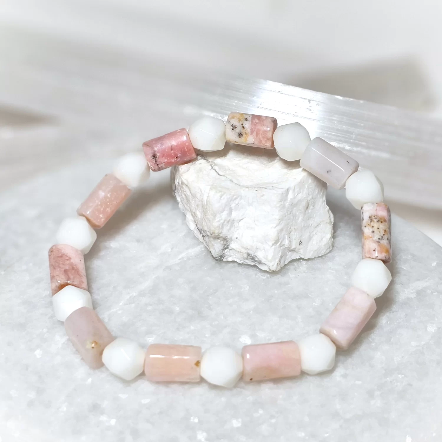 Pastelowa, luksusowa bransoletka, którą tworzą niepowtarzalne, surowe, lekko oszlifowane kamienie. Powstała z opalu różowego o rzadko spotykanym frezie sześciokątnego, nieregularnego walca oraz 6mm szlifowanych kul ceramicznych.  Wszystkie elementy są nawleczone na mocną elastyczną gumkę jubilerską, dzięki której można w mgnieniu oka ściągnąć bądź założyć bransoletkę, co niezmiernie ułatwia jej pielęgnację i codzienne użytkowanie.