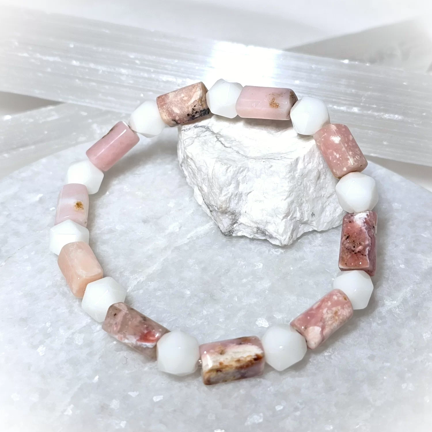 Bransoletka „PINK OPAL” (opal różowy, biała ceramika)