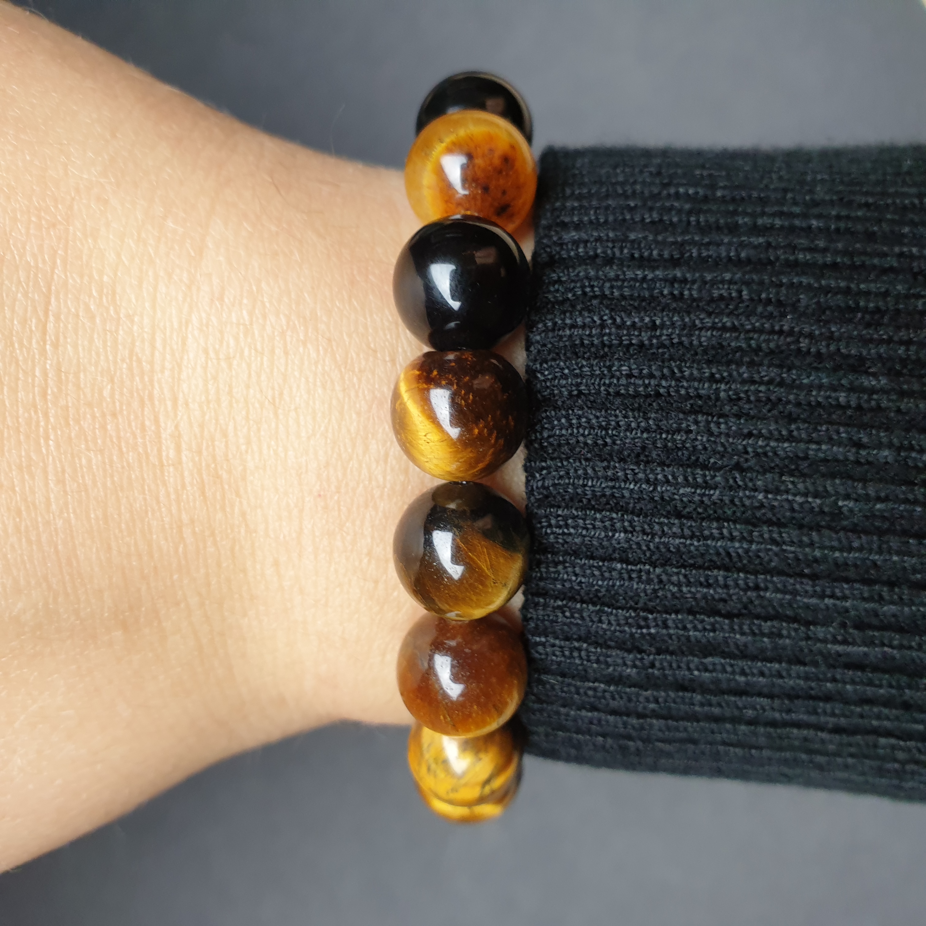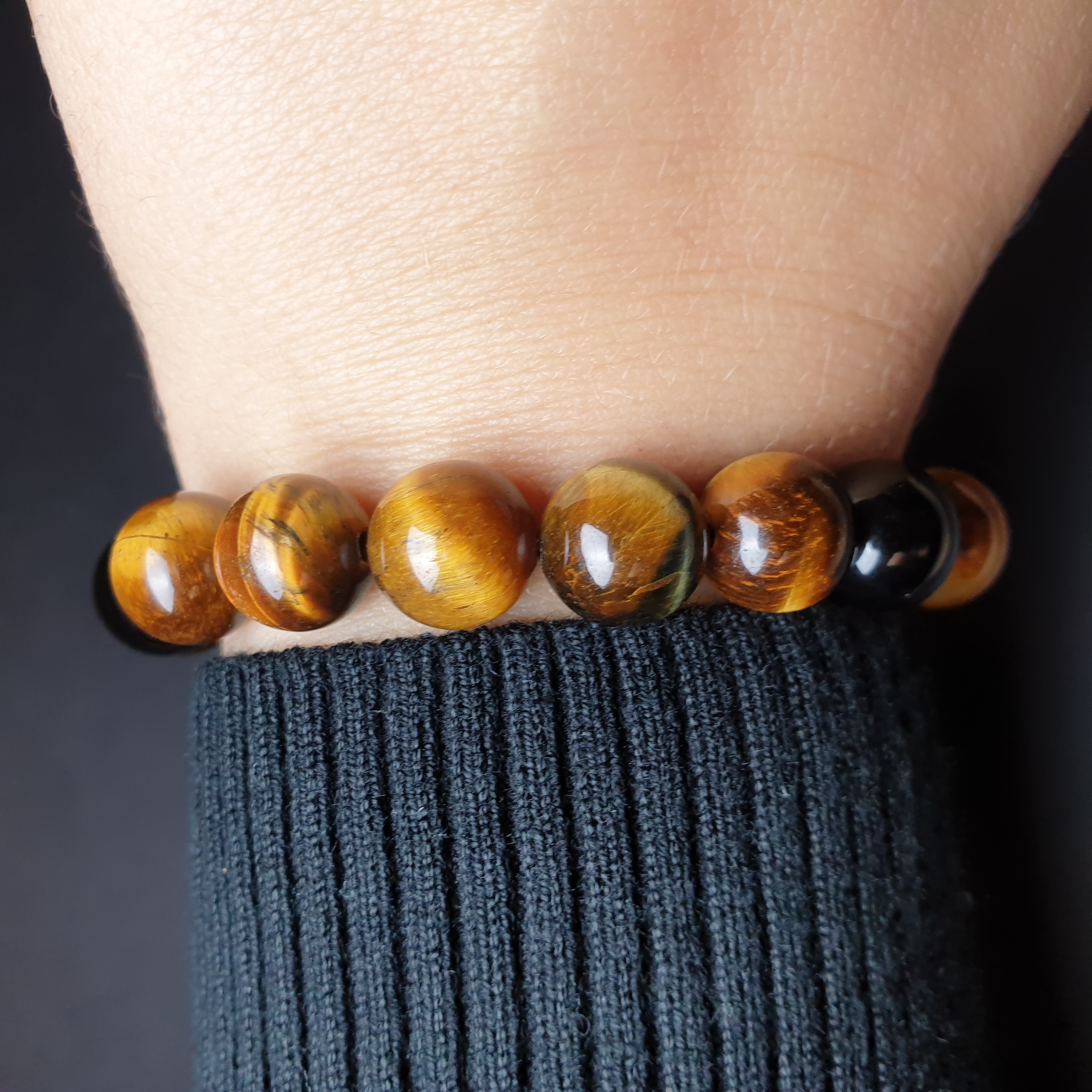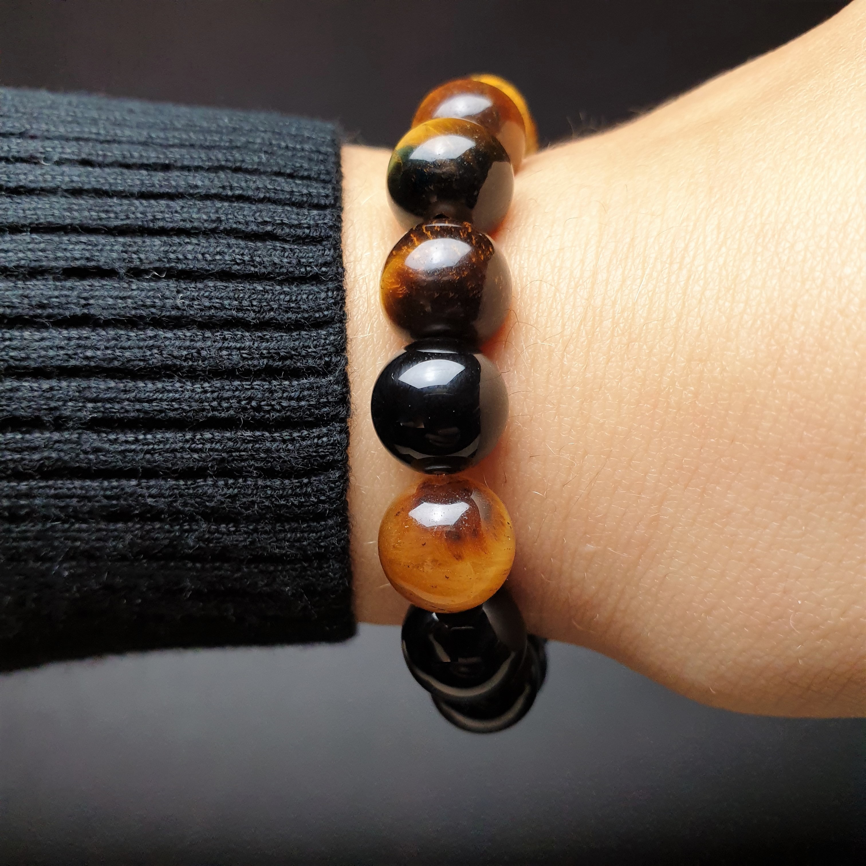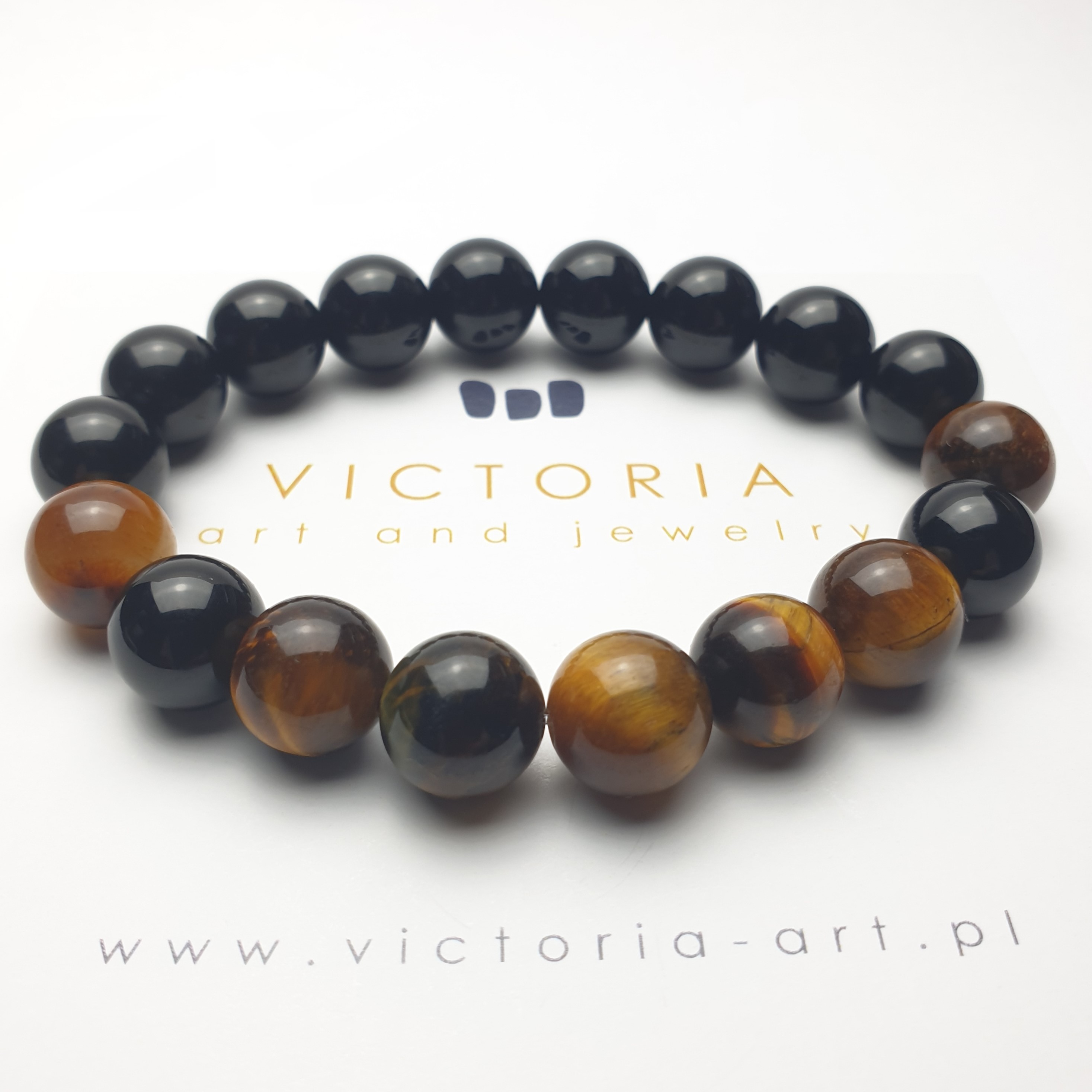 Ta wyjątkowa bransoletka została wykonana z kamieni naturalnych o średnicy 10mm na elastycznej gumce jubilerskiej. O jej unikatowości stanowi niesztampowy, autorski układ elementów i harmonijne zestawienie kolorów. Znaczną część bransoletki „EYE OF THE TIGER” stanowią kule z wyjątkowej odmiany kwarcu zwanej TYGRYSIM OKIEM. Ten popularny i lubiany minerał zawdzięcza swoją nazwę charakterystycznemu zjawisku optycznemu jakie zachodzi podczas zmiany położenia kamienia. Najlepiej można je zaobserwować na wypolerowanej oświetlonej powierzchni. Resztę bransoletki uzupełniają gładkie, błyszczące kule czarnego ONYKSU. Powstaje on w skałach pochodzenia wulkanicznego jest cenionym kamieniem jubilerskim, ponadczasowym, pełnym klasy i wdzięku.