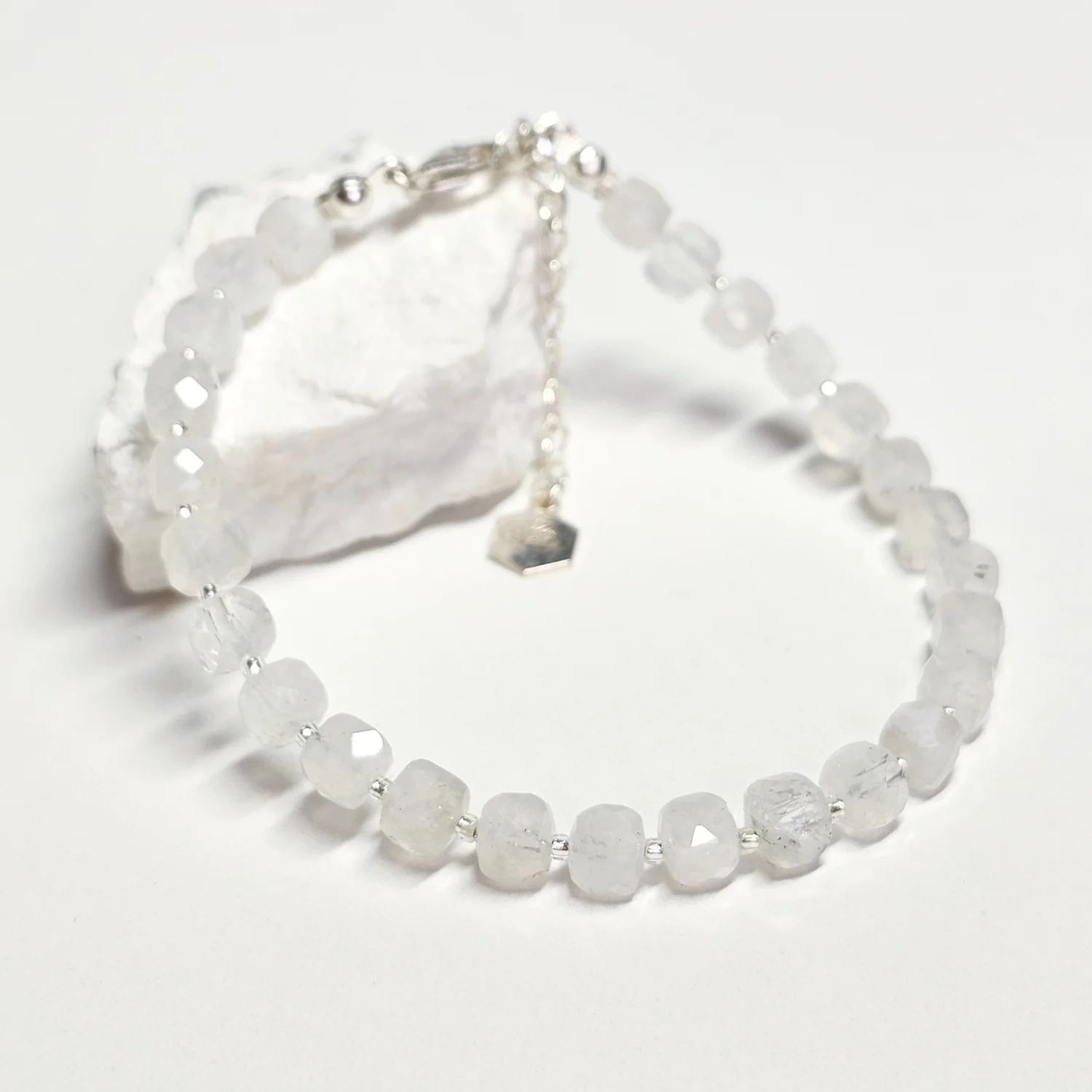 Świetlista bransoletka z kamieni księżycowych to wyjątkowy dodatek, który emanuje subtelnym blaskiem i elegancją. Kamienie księżycowe w kształcie fasetowanych kostek o wymiarze 4 mm zachwycają delikatną grą świateł i niebieskimi refleksami, przypominającymi blask księżyca na nocnym niebie. Ich naturalne piękno zostało podkreślone przez drobne, japońskie koraliki TOHO o srebrzystym połysku, które dodają bransoletce lekkości i nowoczesnego charakteru.