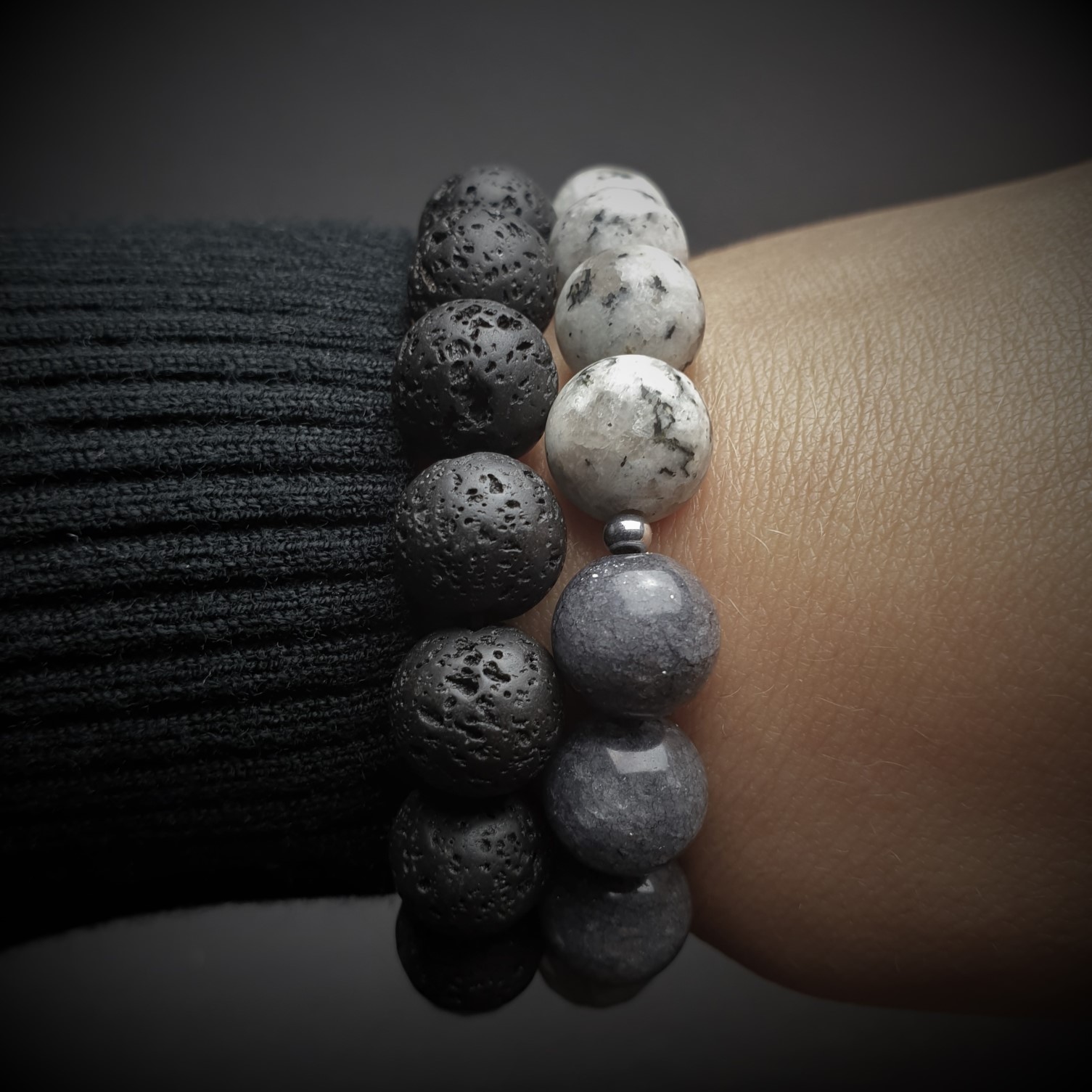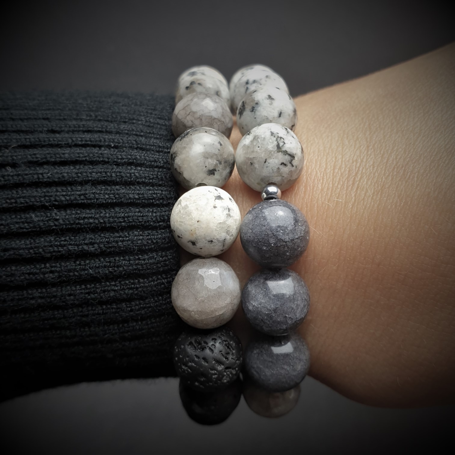 Ta wyjątkowa bransoletka została wykonana z kamieni naturalnych i lawy o średnicy 10mm na elastycznej gumce jubilerskiej. O jej unikatowości stanowi niesztampowy, autorski układ elementów i harmonijne zestawienie kolorów. Stworzona została z JADEITÓW o różnej barwie i fakturze. Najjaśniejsze szare kule są matowe a pozostałe ciemniejsze, gładkie i błyszczące. Cywilizacje z zamierzchłych czasów wykorzystywały jadeit do wyrobu ozdób, naczyń, amuletów a nawet posągów. Resztę bransoletki uzupełniają kule LAWY WULKANICZNEJ, które nawleczone naprzemiennie kontrastują z pozostałymi kamieniami podbijając ich unikatowe wartości estetyczne. Surowe piękno lawy przyciąga osoby ceniące naturę i pierwotny urok nieprzetworzonych darów ziemi. Sposób w jaki powstaje oraz jej pochodzenie sprawiły, że ludzie zaczęli przypisywać jej specjalne właściwości. Ponadto lawa dzięki swojej porowatej powierzchni doskonale chłonie różnego typu olejki eteryczne i może być wykorzystywana przy aromaterapii.