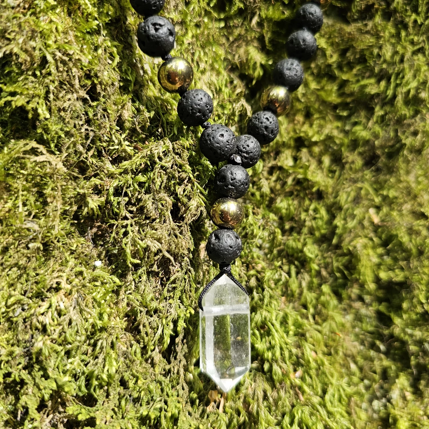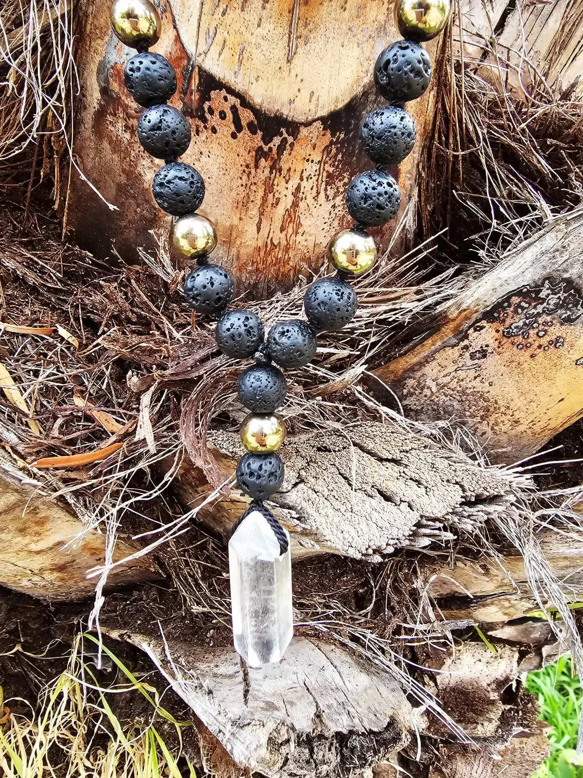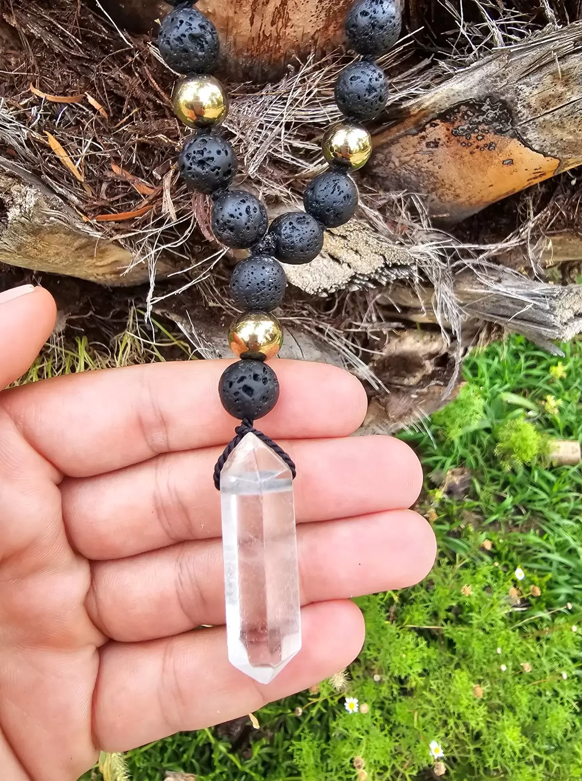 Naszyjnik "AFRICANA" z przezroczystą zawieszką z Kryształu Górskiego o wymiarach około 4cmx1,2cm, powstał z kul kamieni o średnicy 1cm. Jest on wykonany tą samą metodą co buddyjska mala, każdy koral oddzielony jest od kolejnego supełkiem co powoduje, że naszyjnik jest delikatnie elastyczny, plastyczny i układa się swobodnie na ciele. Sznurek nylonowy na który nawleczone zostały kamienie jest w kolorze czarnym, mocny i trwały.