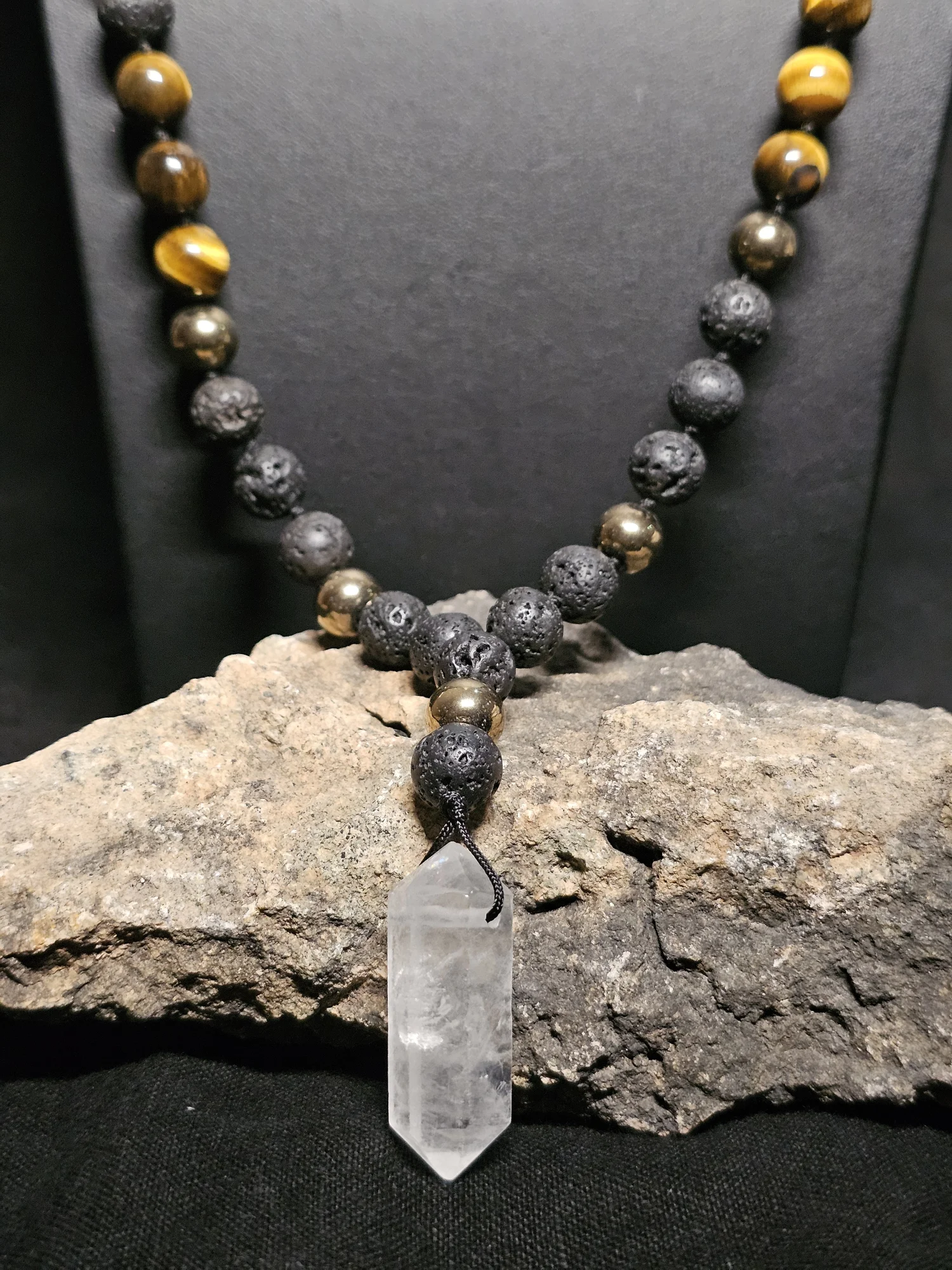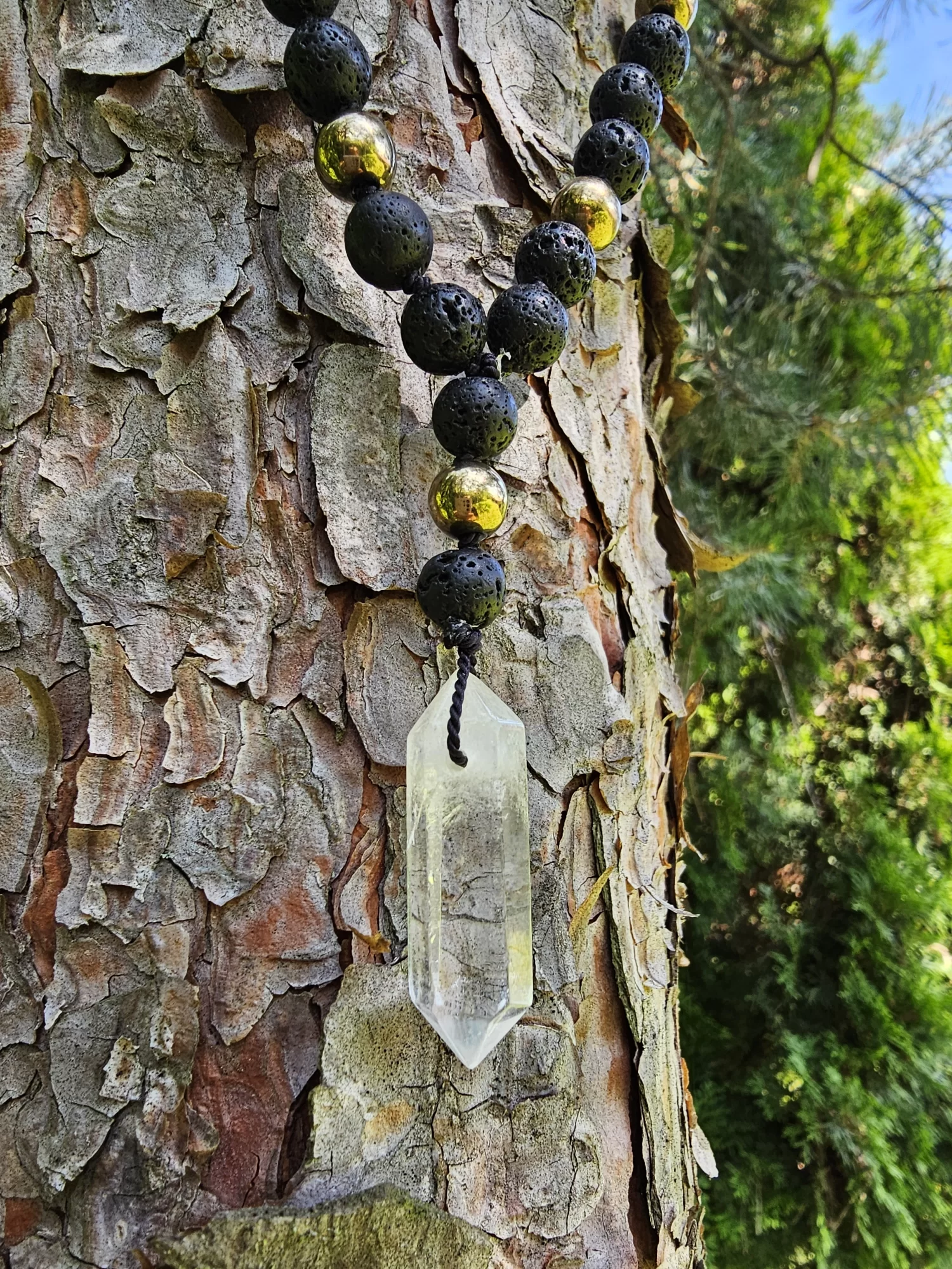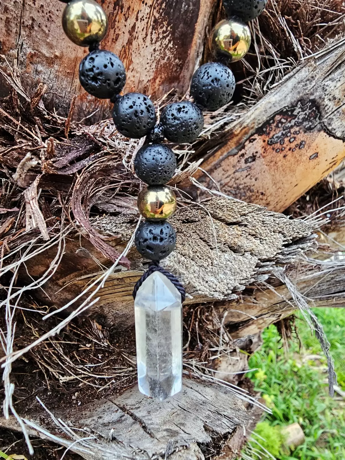 Naszyjnik "AFRICANA" z przezroczystą zawieszką z Kryształu Górskiego o wymiarach około 4cmx1,2cm, powstał z kul kamieni o średnicy 1cm. Jest on wykonany tą samą metodą co buddyjska mala, każdy koral oddzielony jest od kolejnego supełkiem co powoduje, że naszyjnik jest delikatnie elastyczny, plastyczny i układa się swobodnie na ciele. Sznurek nylonowy na który nawleczone zostały kamienie jest w kolorze czarnym, mocny i trwały.
