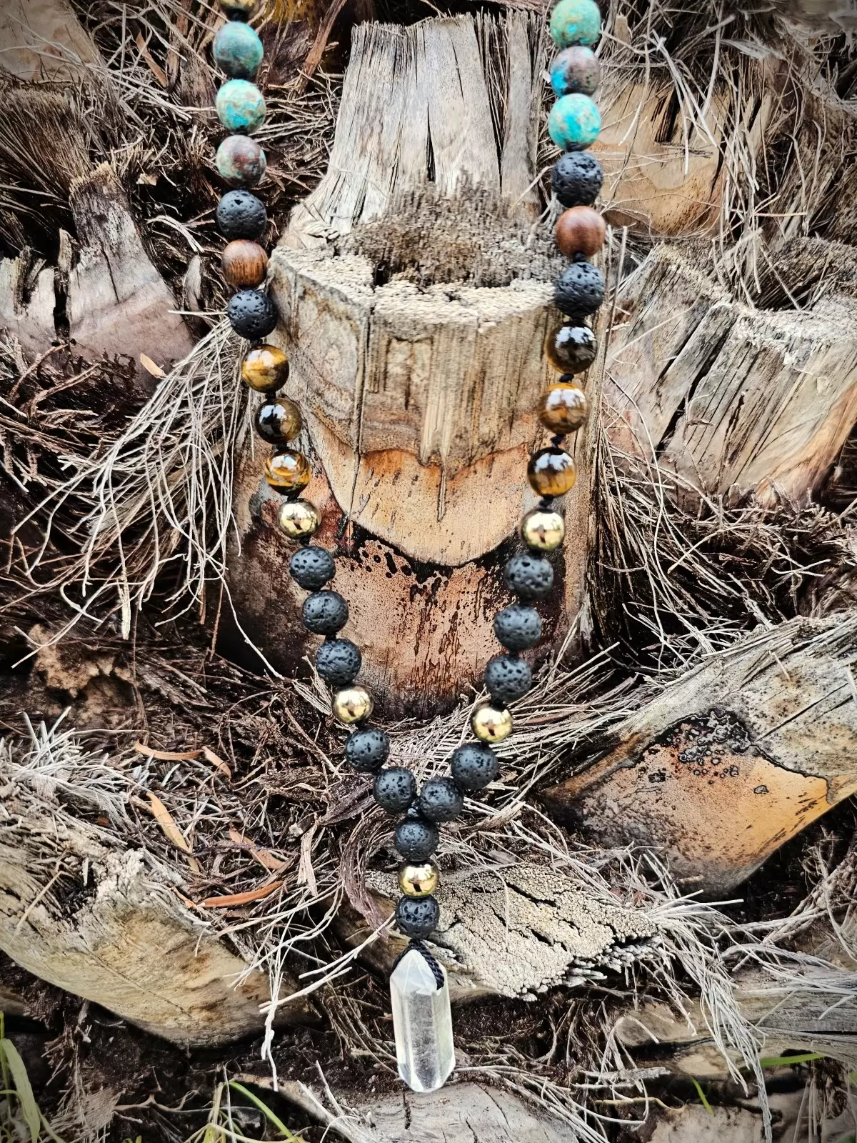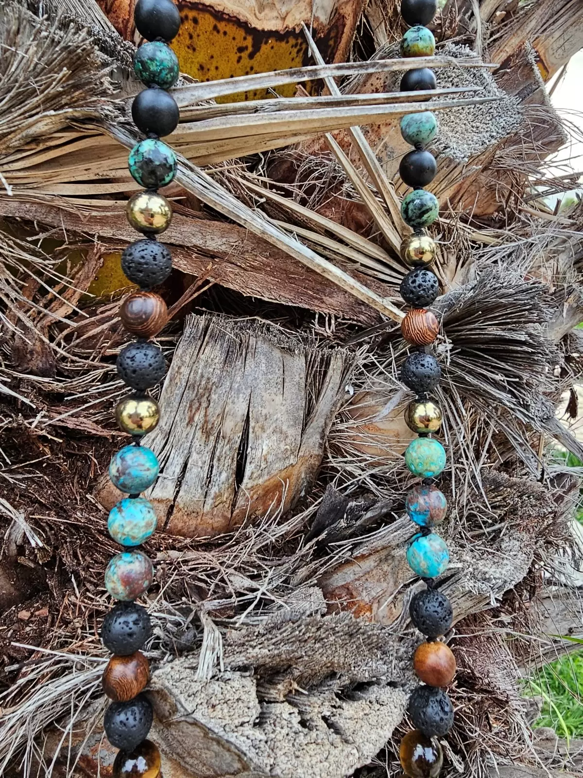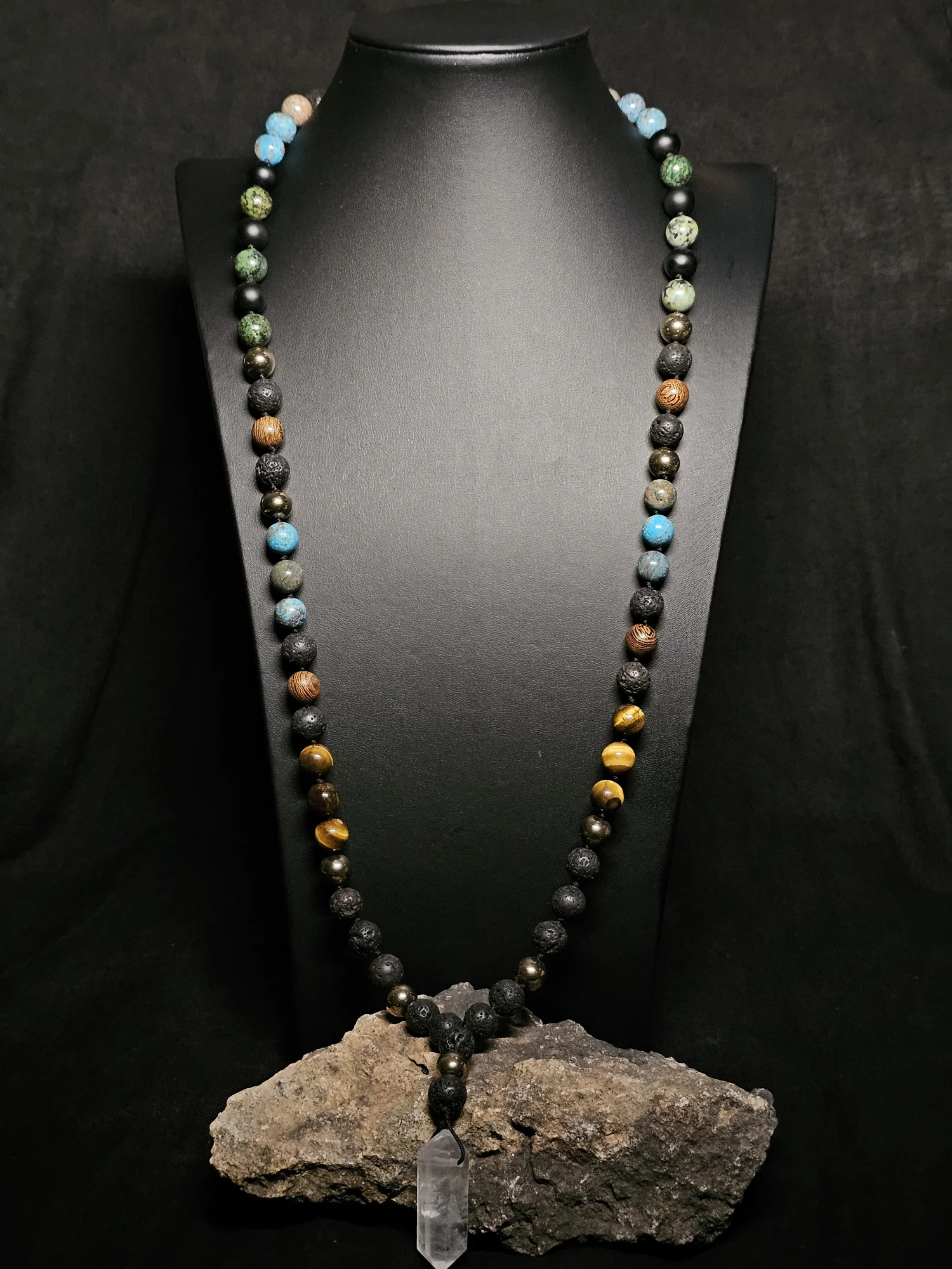 Długi naszyjnik Mala "AFRICANA" (tygrysie oko, hematyt jasne złoto, jaspis niebieski, turkus afrykański, turmalin matowy, lawa, kryształ górski, drewno)