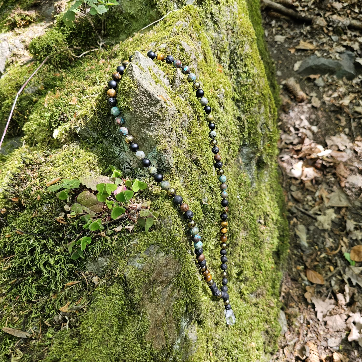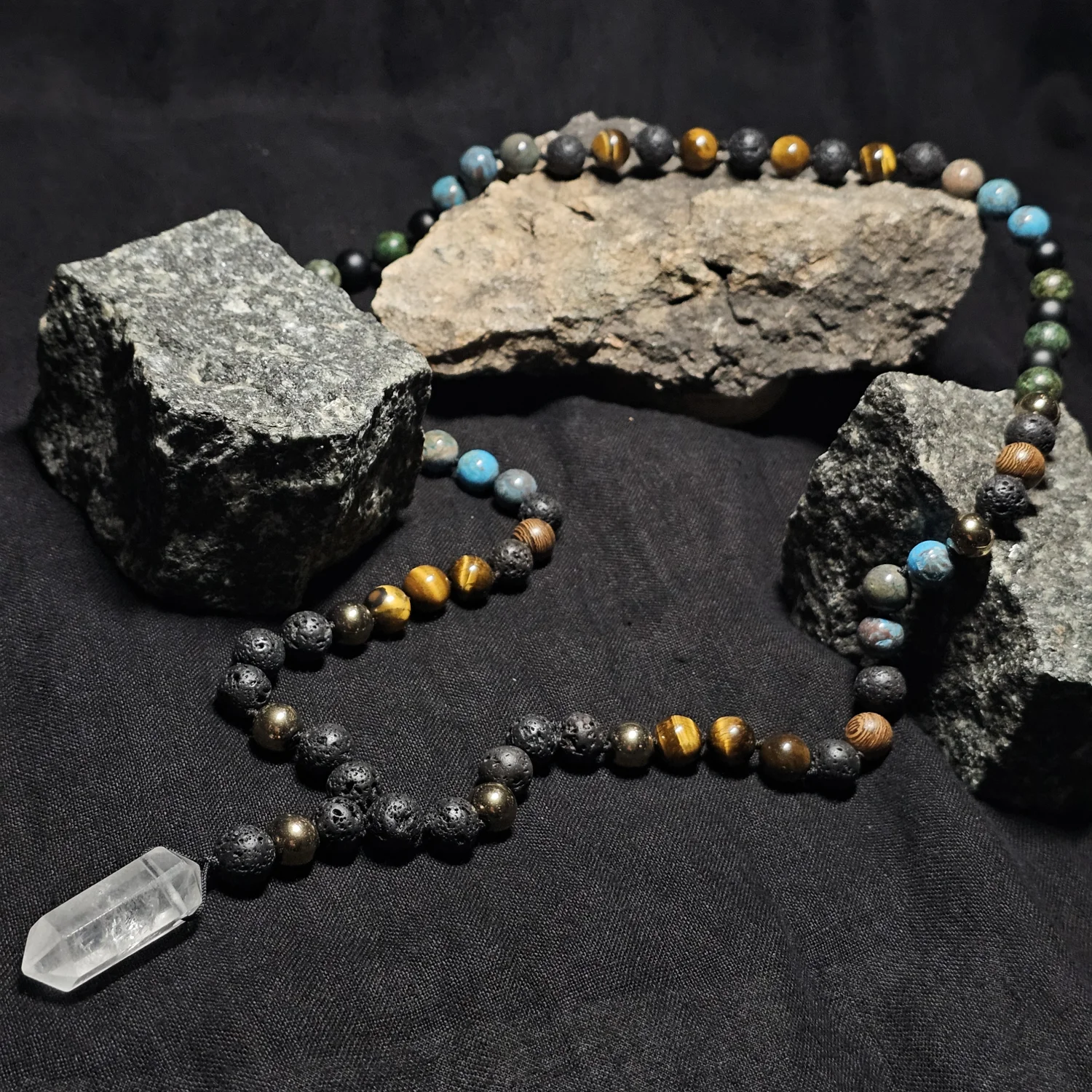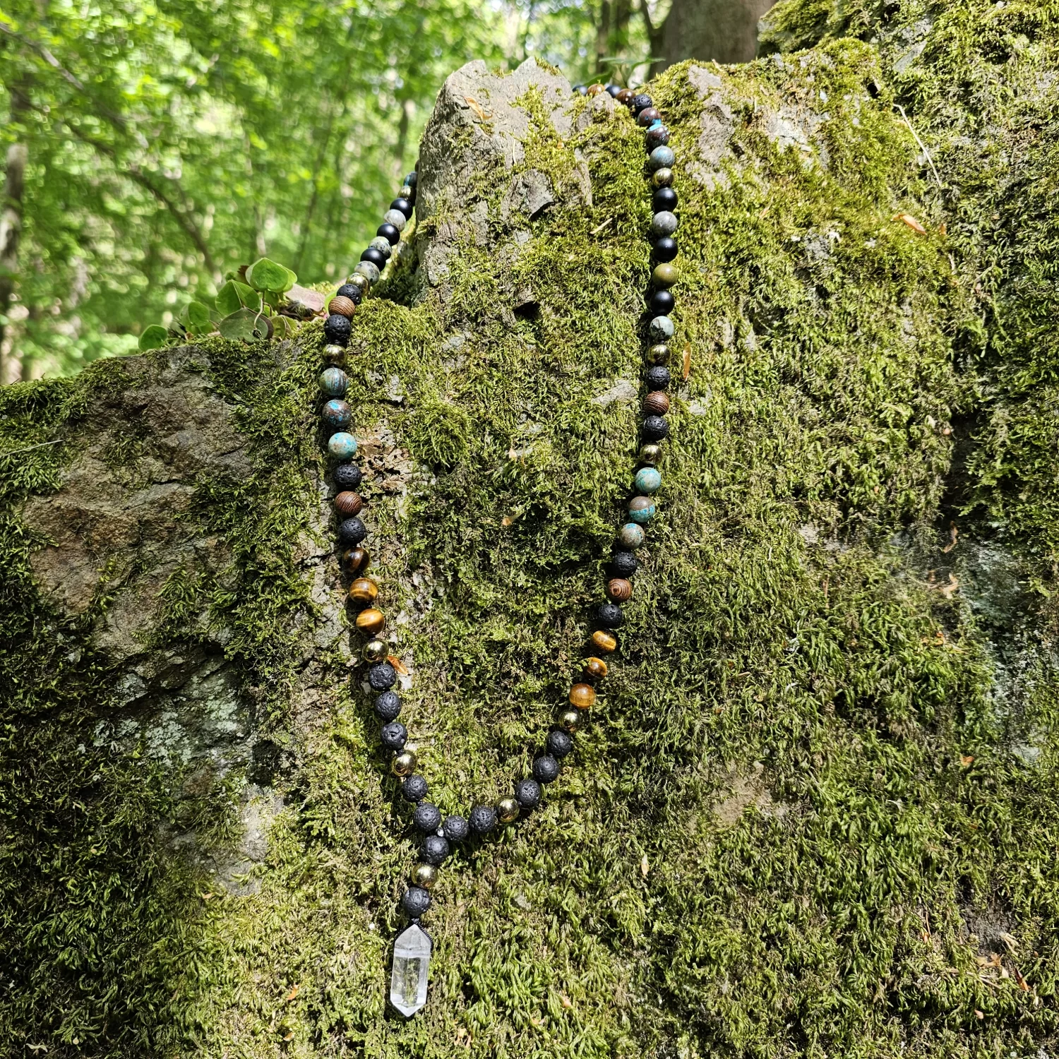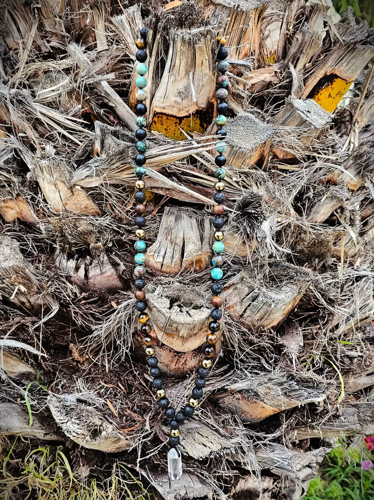 Długi naszyjnik Mala "AFRICANA" (tygrysie oko, hematyt jasne złoto, jaspis niebieski, turkus afrykański, turmalin matowy, lawa, kryształ górski, drewno)