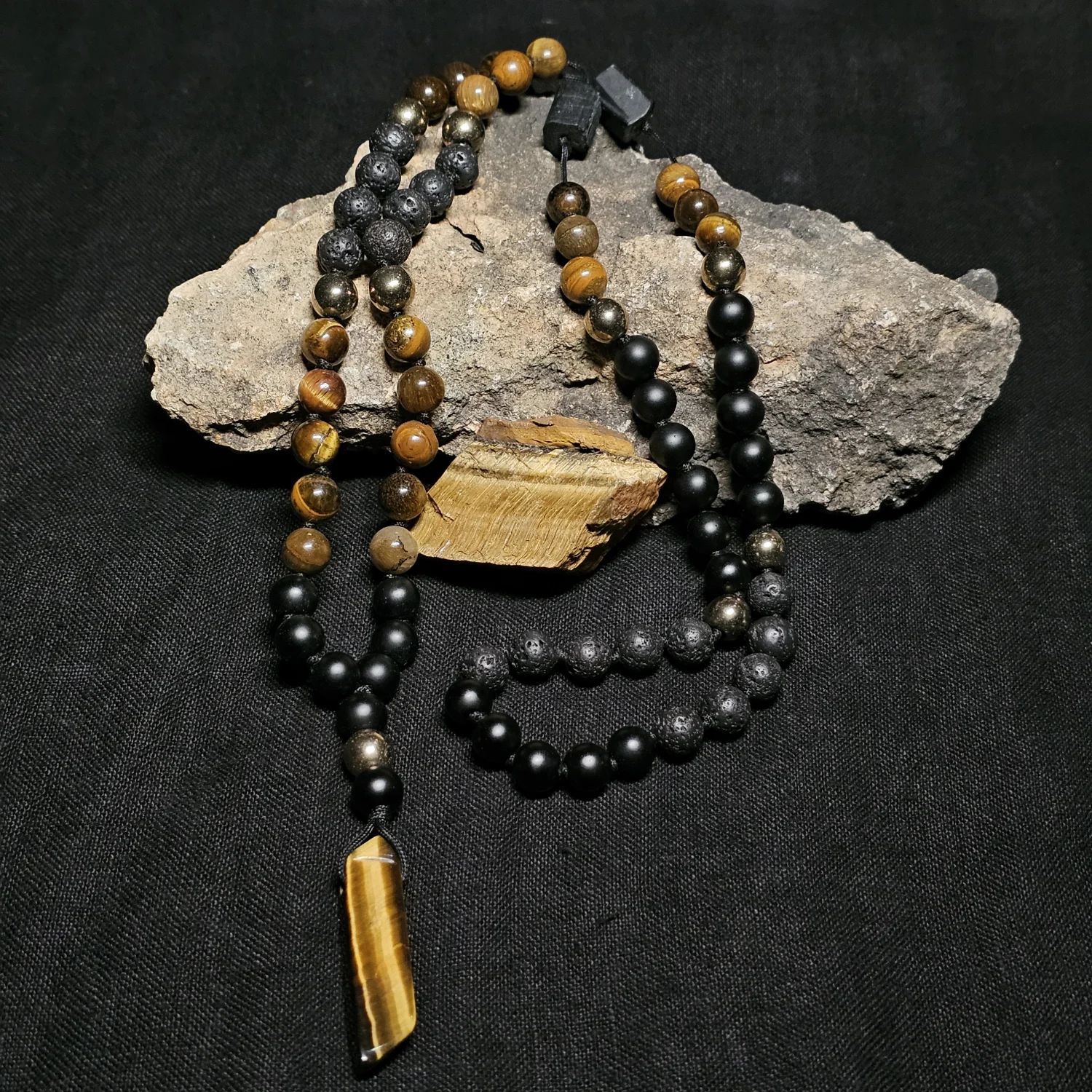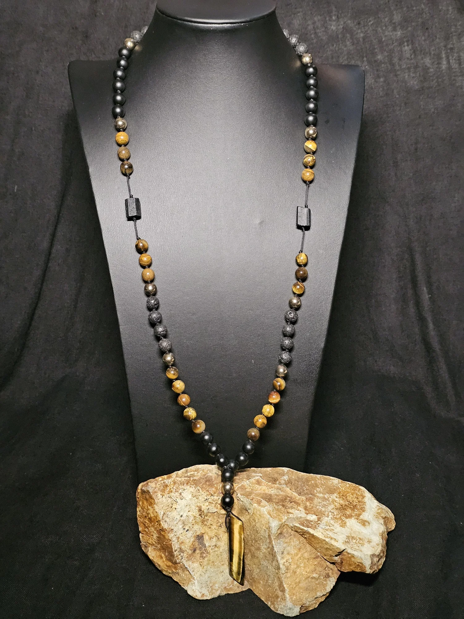 Długi naszyjnik Mala "TIGER EYE" (tygrysie oko, onyks, lawa, hematyt, turmalin)