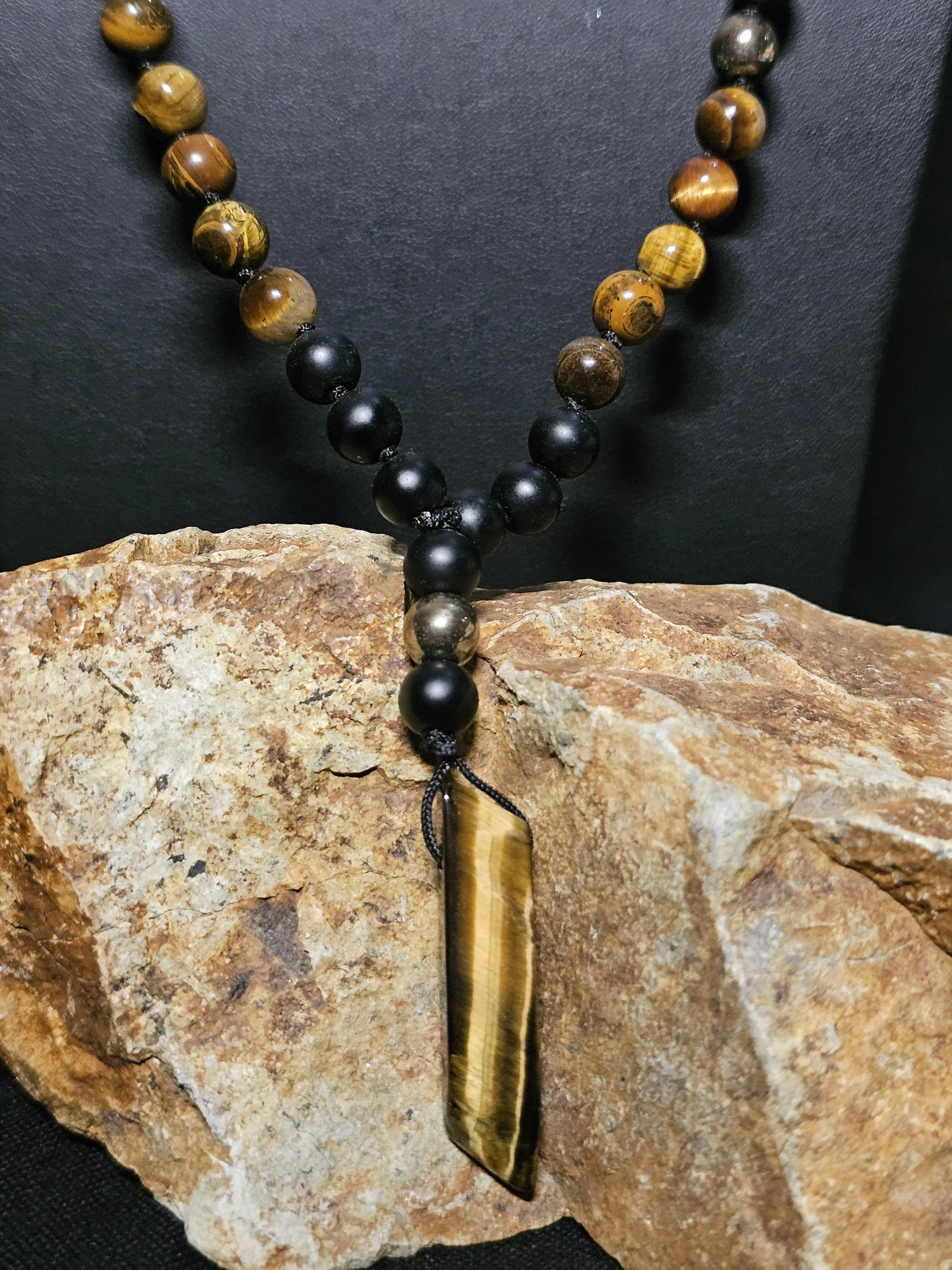Nieregularne, ciosane bryłki czarnego turmalinu swobodnie zwisają po bokach, nadając naszyjnikowi lekkości i nieoczywistego charakteru. Centralnym punktem jest zawieszka w kształcie sopla, wykonana z tygrysiego oka (4x0,9 cm), która dopełnia całości i nadaje jej lekko designerskiego sznytu.