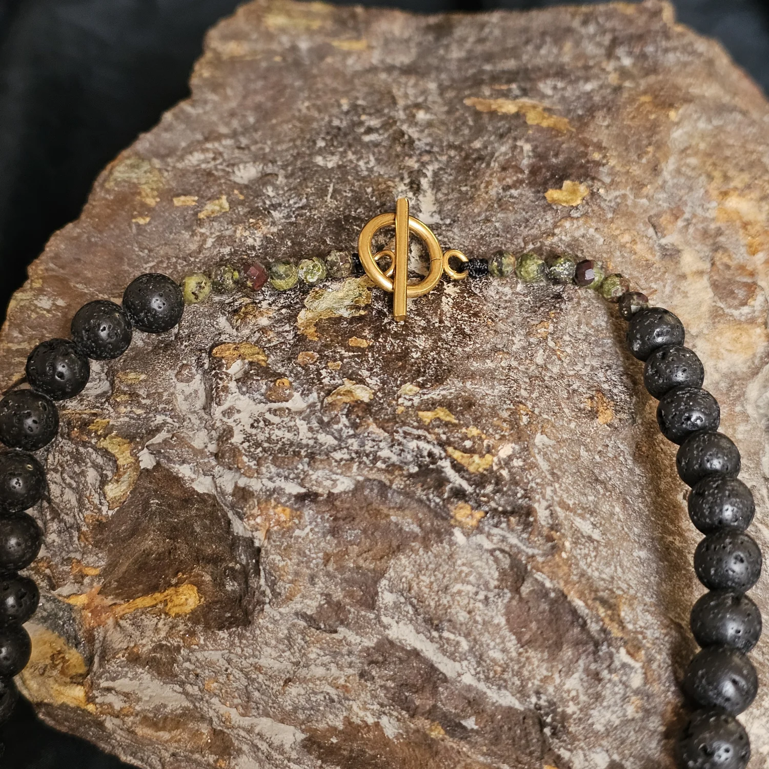 Drobne, pojedyncze kulki tytanizowanego hematytu w kolorze starego złota, wprowadzają do naszyjnika subtelną industrialną nutę. W dalszej części naszyjnika znajdują się 8mm kule lawy wulkanicznej, które wprowadzają dzikość i energię, przypominając o potędze ziemskich żywiołów.