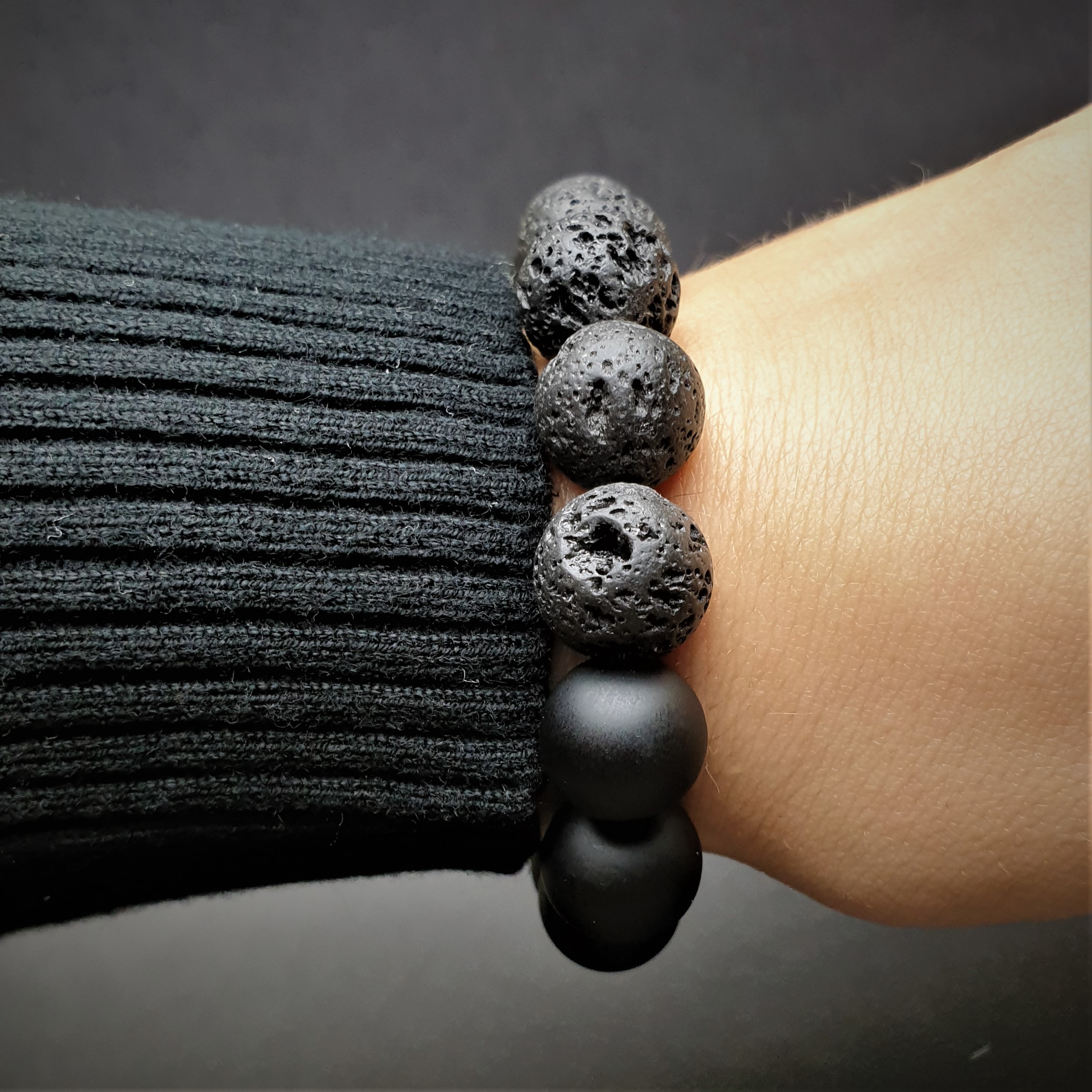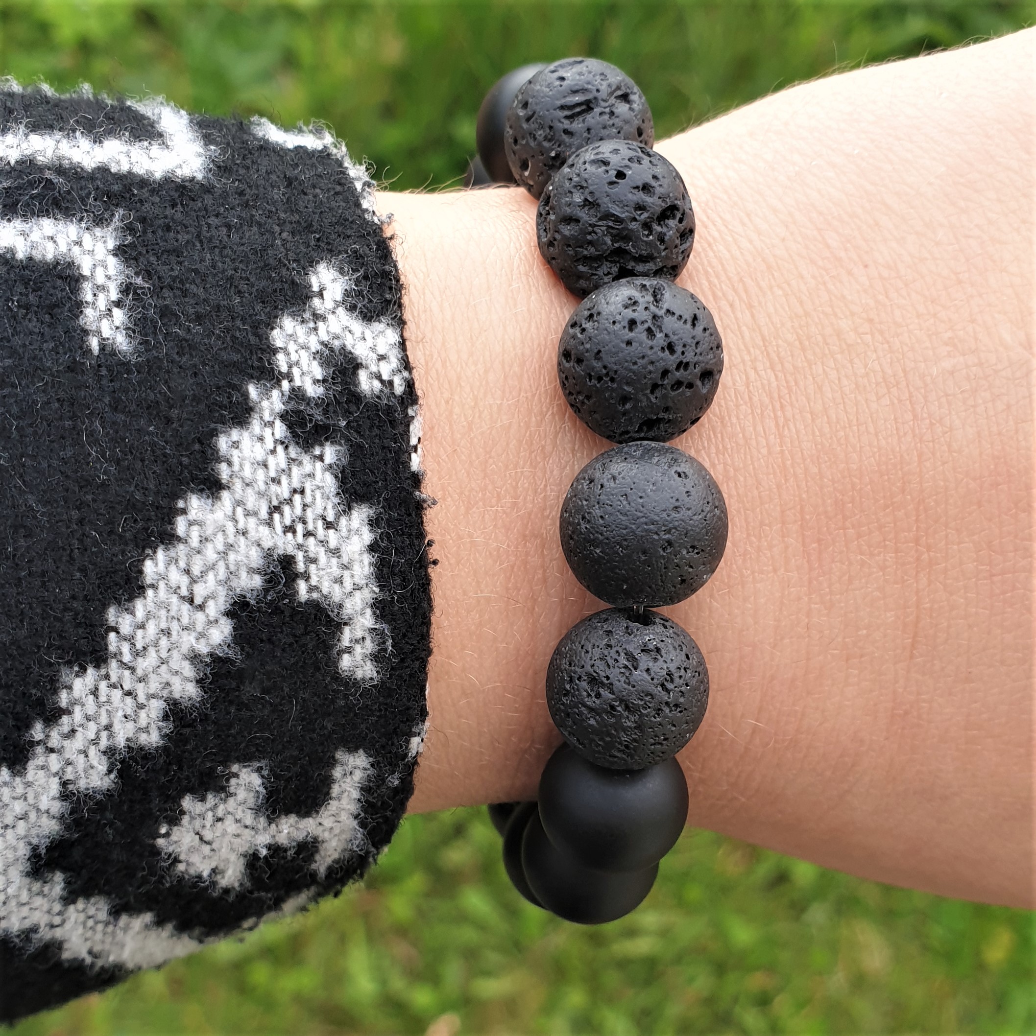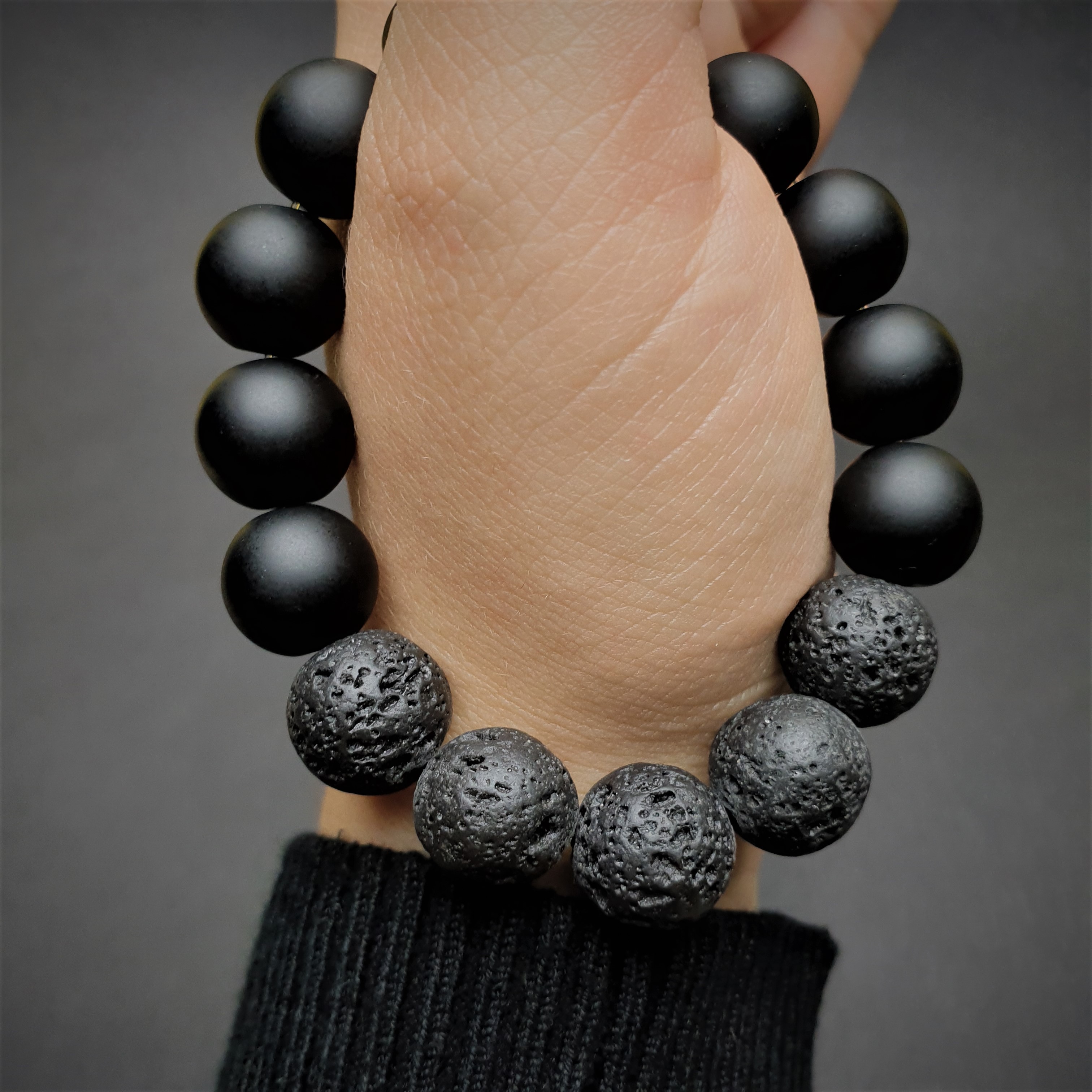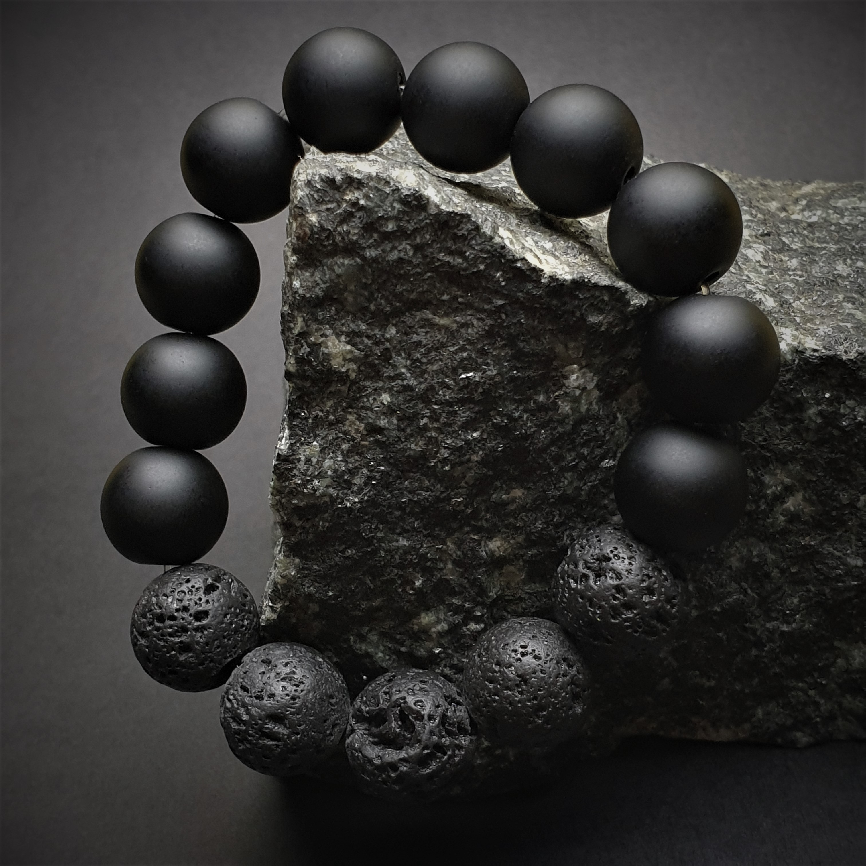 Ta wyjątkowa bransoletka została wykonana z lawy i kamieni o średnicy 12mm na elastycznej gumce jubilerskiej. O jej unikatowości stanowi niesztampowy, autorski układ elementów. Znaczną część bransoletki tworzy 12mm LAWA WULKANICZNA. Sposób w jaki powstaje oraz jej pochodzenie sprawiły, że ludzie zaczęli przypisywać jej specjalne właściwości. Surowe piękno tego kamienia przyciąga osoby ceniące naturę i pierwotny urok nieprzetworzonych darów ziemi. Ponadto lawa dzięki swojej porowatej powierzchni doskonale chłonie różnego typu olejki eteryczne i może być wykorzystywana przy aromaterapii. Resztę bransoletki uzupełniają gładkie, matowe, 12mm kule czarnego ONYKSU. Powstaje on w skałach pochodzenia wulkanicznego jest cenionym kamieniem jubilerskim, ponadczasowym, pełnym klasy i wdzięku. Ze względu na swoje cechy charakterystyczne tworzą ciekawą i stylową bransoletkę.