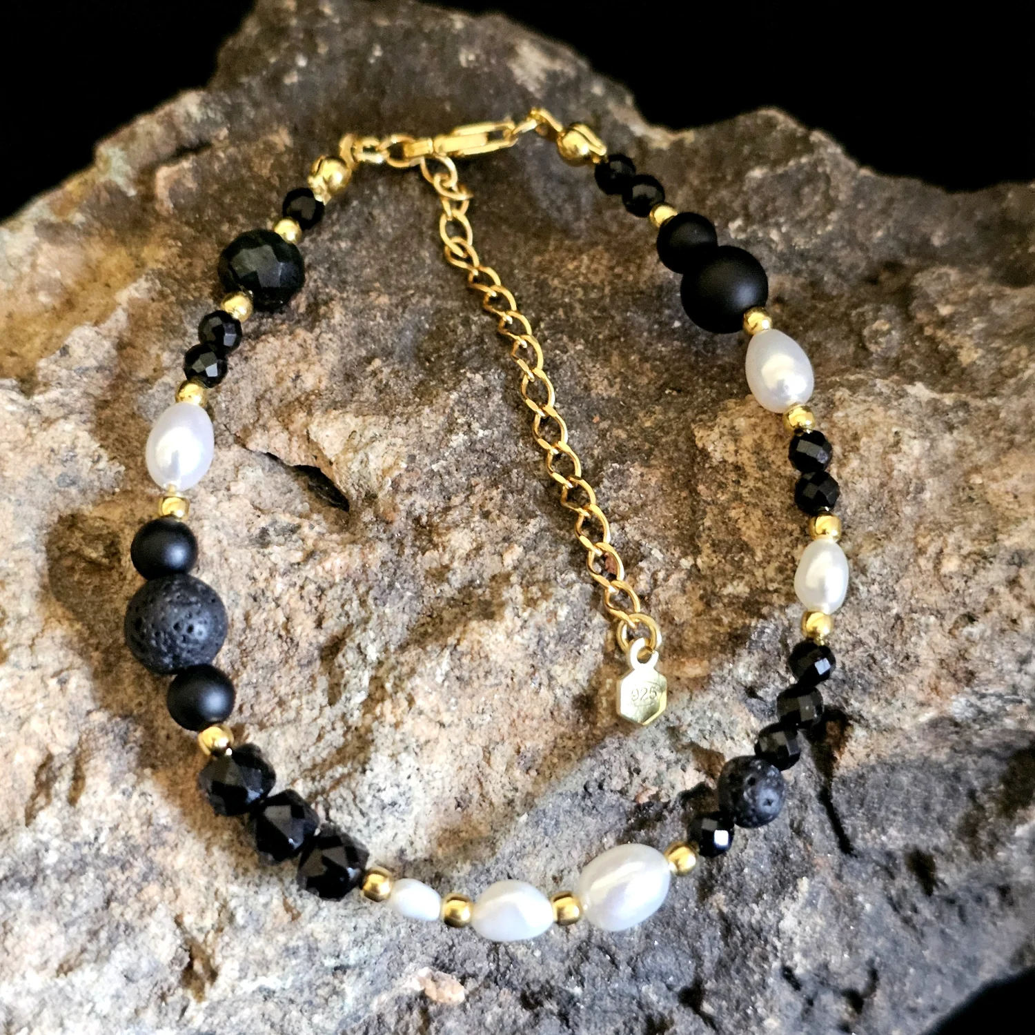 Bransoletkę zdobią naturalne perły rzeczne o długości ok. 7, 5 oraz 3 mm, które wnoszą do projektu nutę delikatności i kobiecego blasku. Ich naturalny połysk został zestawiony z intensywnie czarnymi, niekiedy surowymi kamieniami – fasetowanymi kostkami turmalinu 4×4mm, matowym onyksem (6 i 4 mm) oraz lśniącym larvikitem o średnicy 6 mm, mieniącym się subtelnym, szarym ogniem.