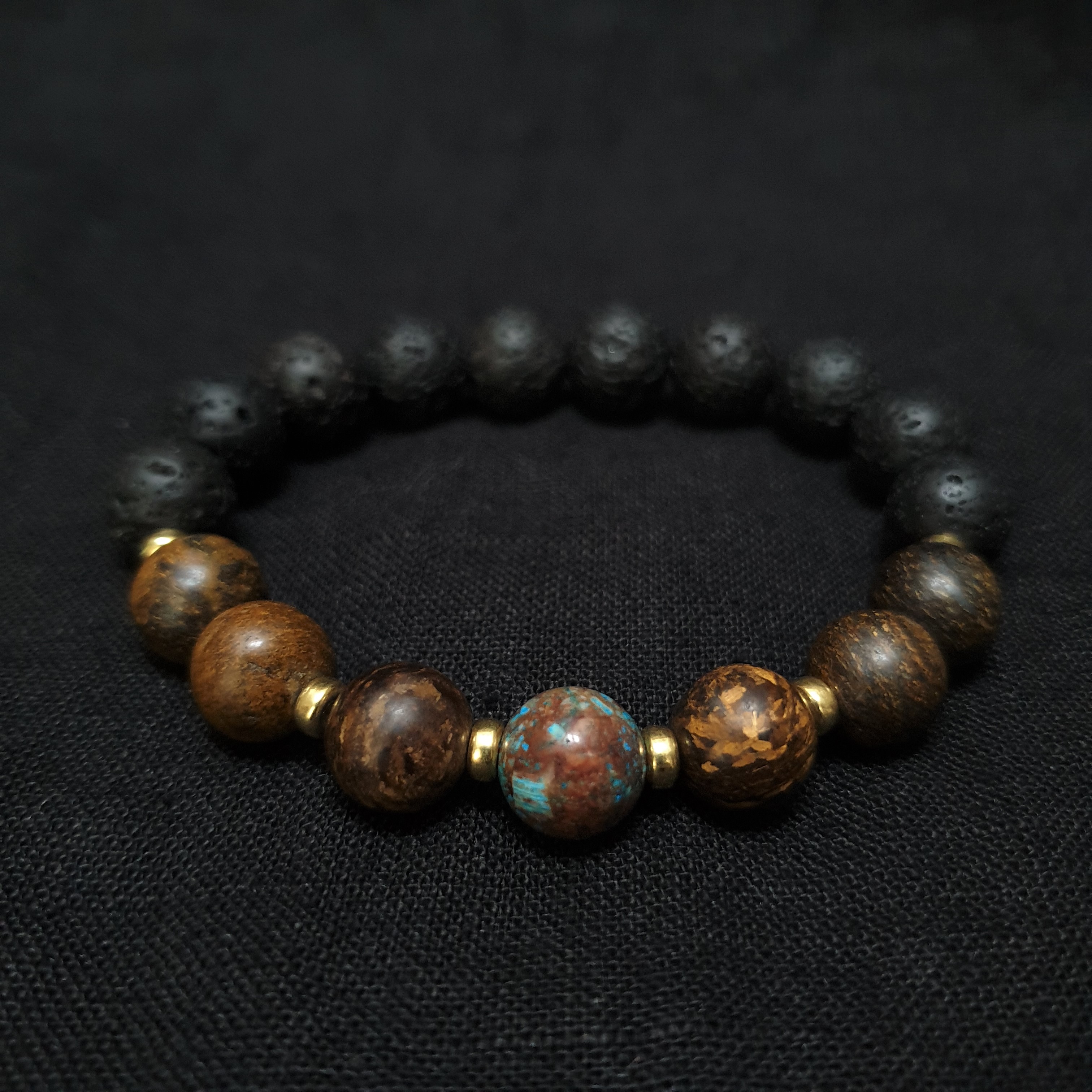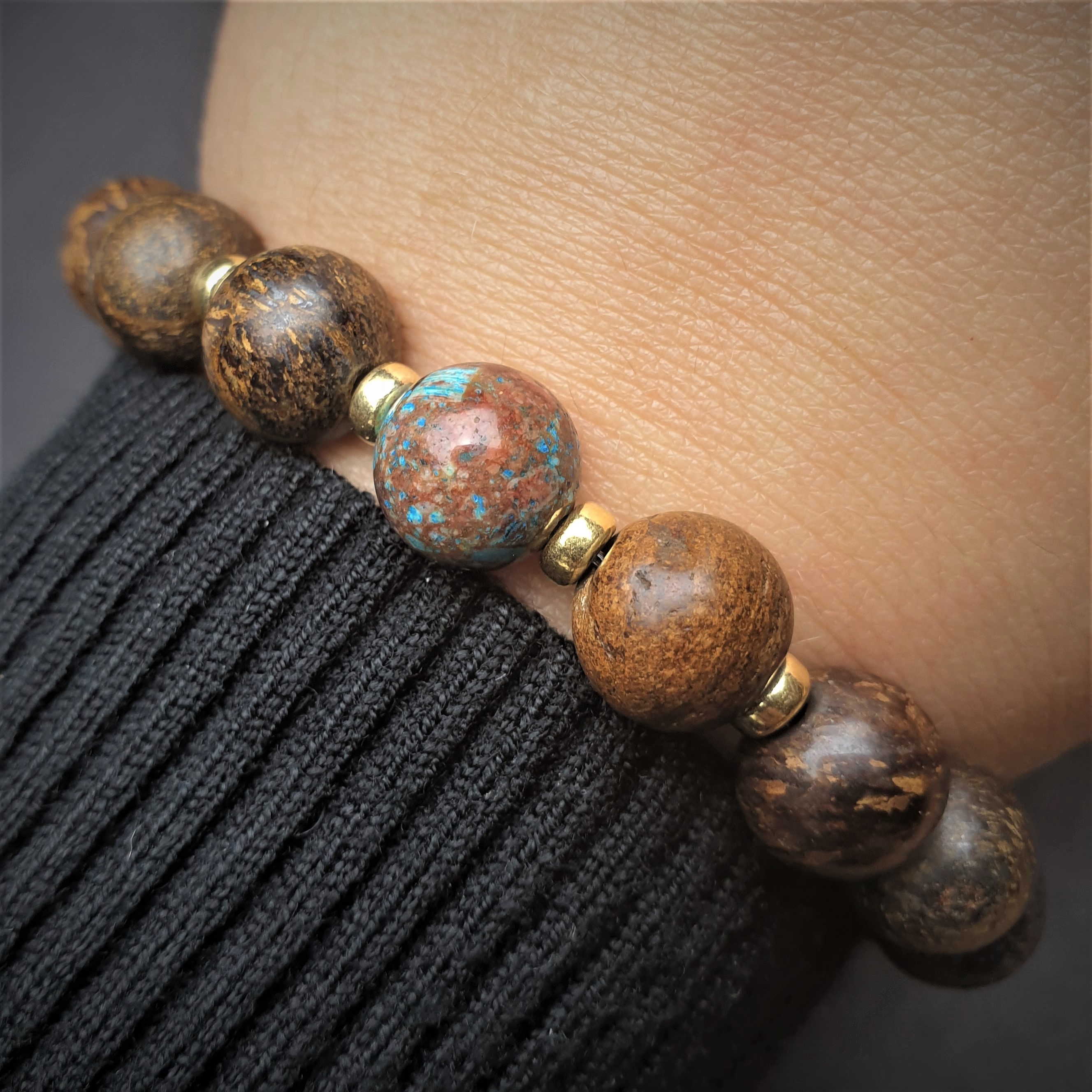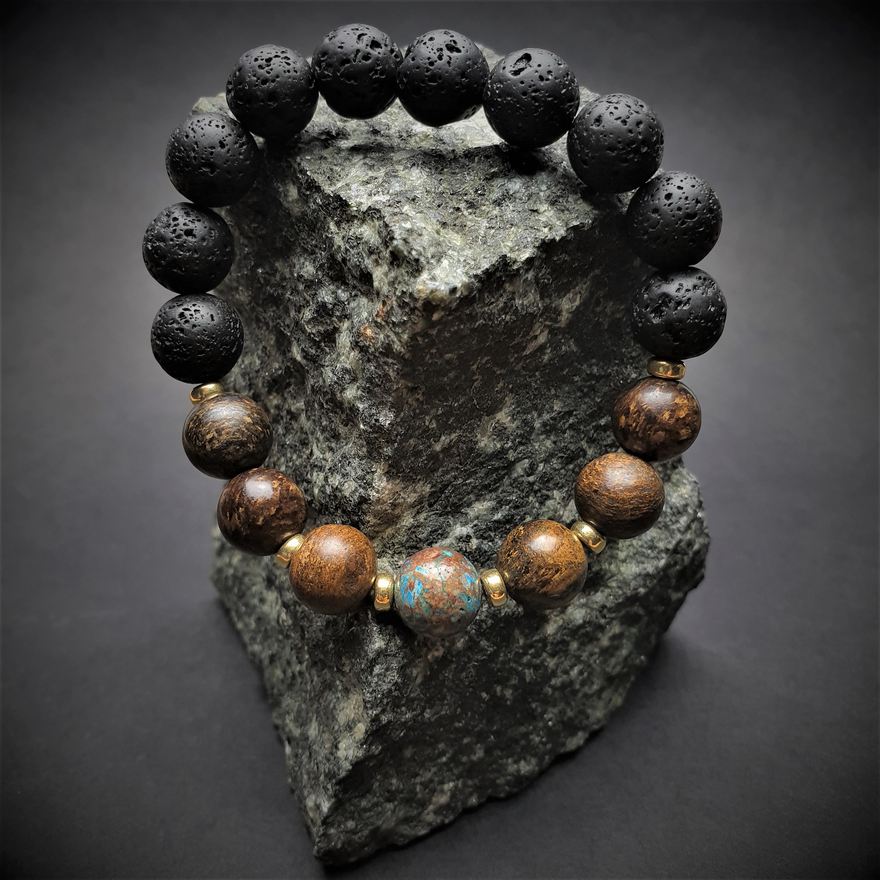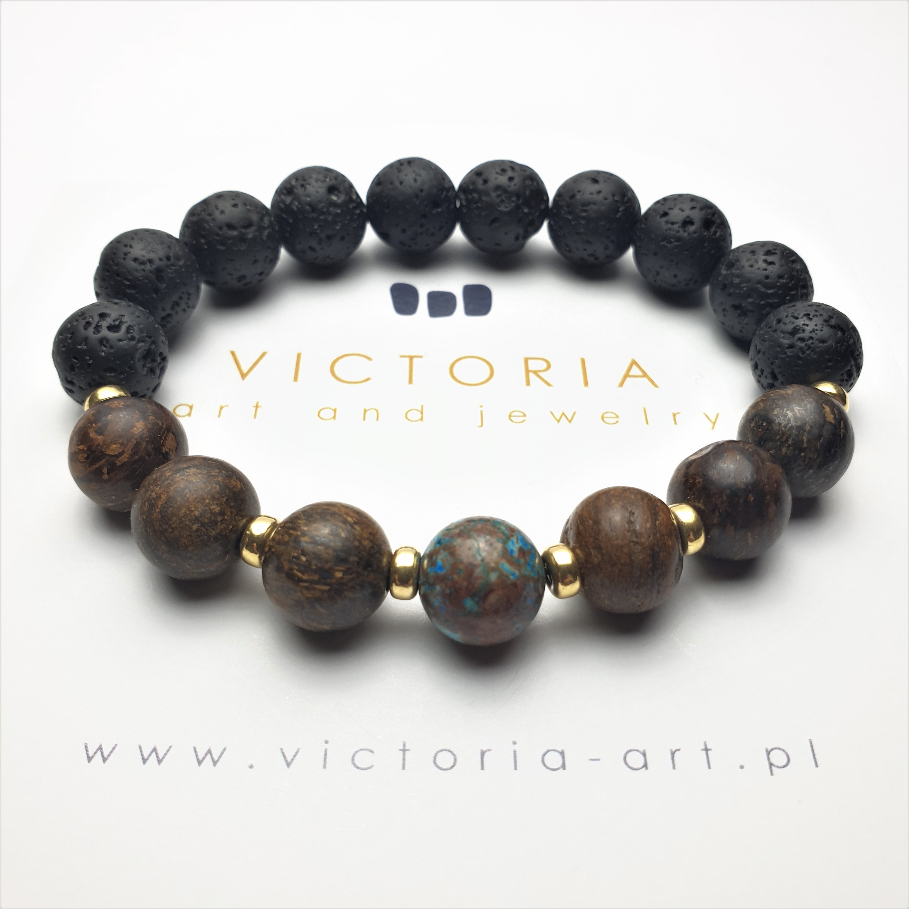 Ta wyjątkowa bransoletka została wykonana z kamieni naturalnych o średnicy 10mm oraz ze srebrnych przekładek pokrytych złotem na elastycznej gumce jubilerskiej. O jej unikatowości stanowi niesztampowy, autorski układ elementów i spójne zestawienie kolorów. Znaczną część bransoletki tworzy LAWA WULKANICZNA. Sposób w jaki powstaje oraz jej pochodzenie sprawiły, że ludzie zaczęli przypisywać jej specjalne właściwości. Ponadto lawa dzięki swojej porowatej powierzchni doskonale chłonie różnego typu olejki eteryczne i może być wykorzystywana przy aromaterapii. BRONZYT jest stosunkowo twardym minerałem. Nawet w matowej wersji kuli w promieniach słońca mieni się kolorami antycznego złota, orzecha i gorzkiej czekolady. W zestawieniu ze złotymi przekładkami tworzy ponadczasową, szlachetną kompozycję. JASPIS NIEBIESKI jest jednym z bardziej cenionych kamieni w jubilerstwie. W „EARTHY VIBES” kula jaspisu umieszczona jest centralnie. Jego niebieska barwa przyciąga wzrok a brązowe plamki harmonijnie nawiązują do sąsiadujących z nim kul bronzytu.