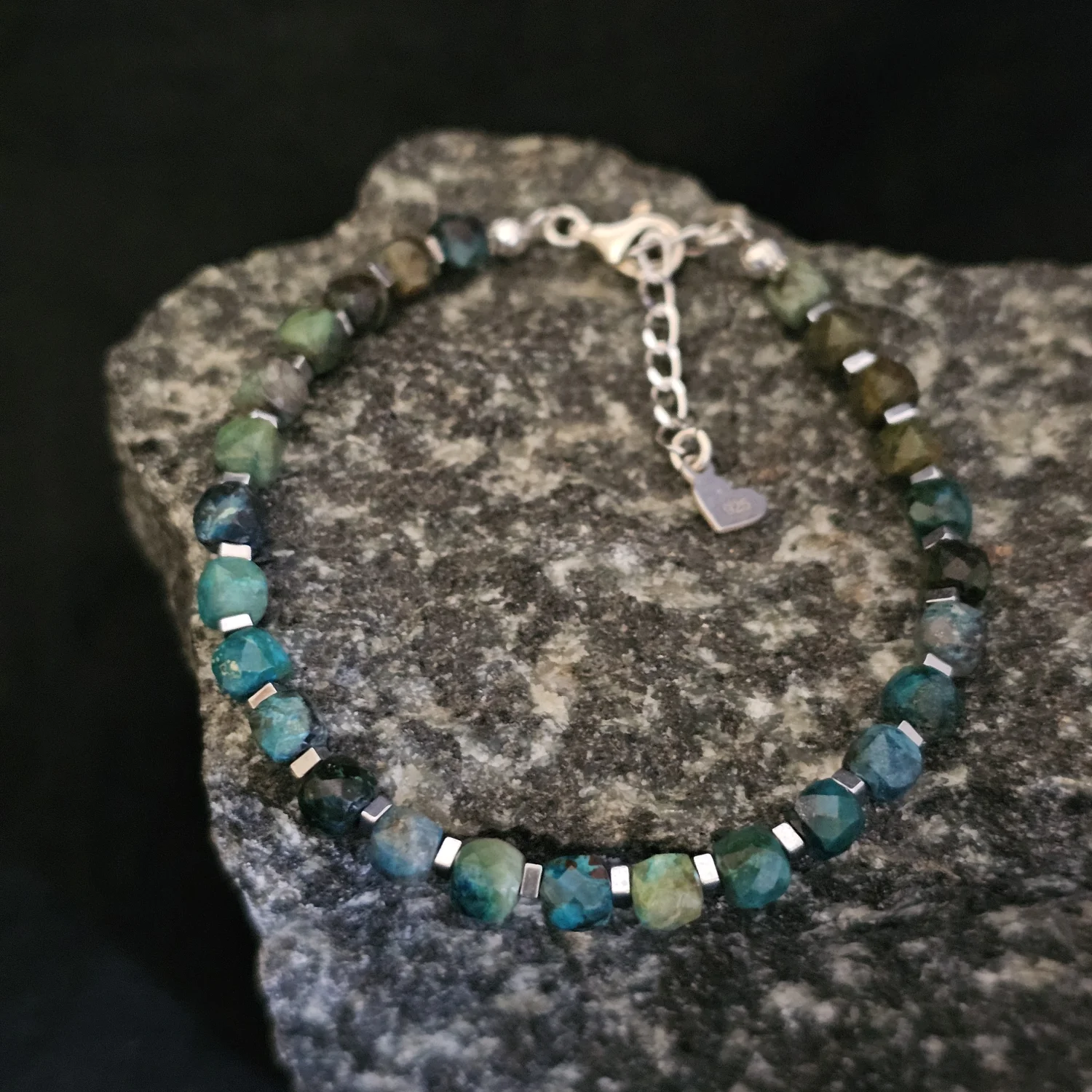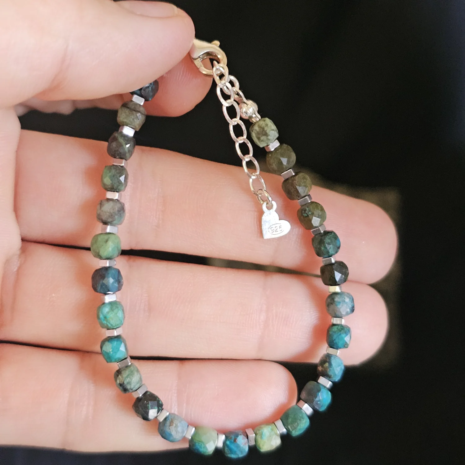 Bransoletkę tworzą fasetowane kostki turkusu afrykańskiego o wymiarach 4×4 mm, których delikatny szlif pięknie wydobywa wielotonowe barwy kamienia. Każdy element jest niepowtarzalny – jedne kostki mają chłodne, zielonkawe tony, inne muśnięte są ciepłymi brązami i czernią, co sprawia, że całość nabiera naturalnego, organicznego charakteru.