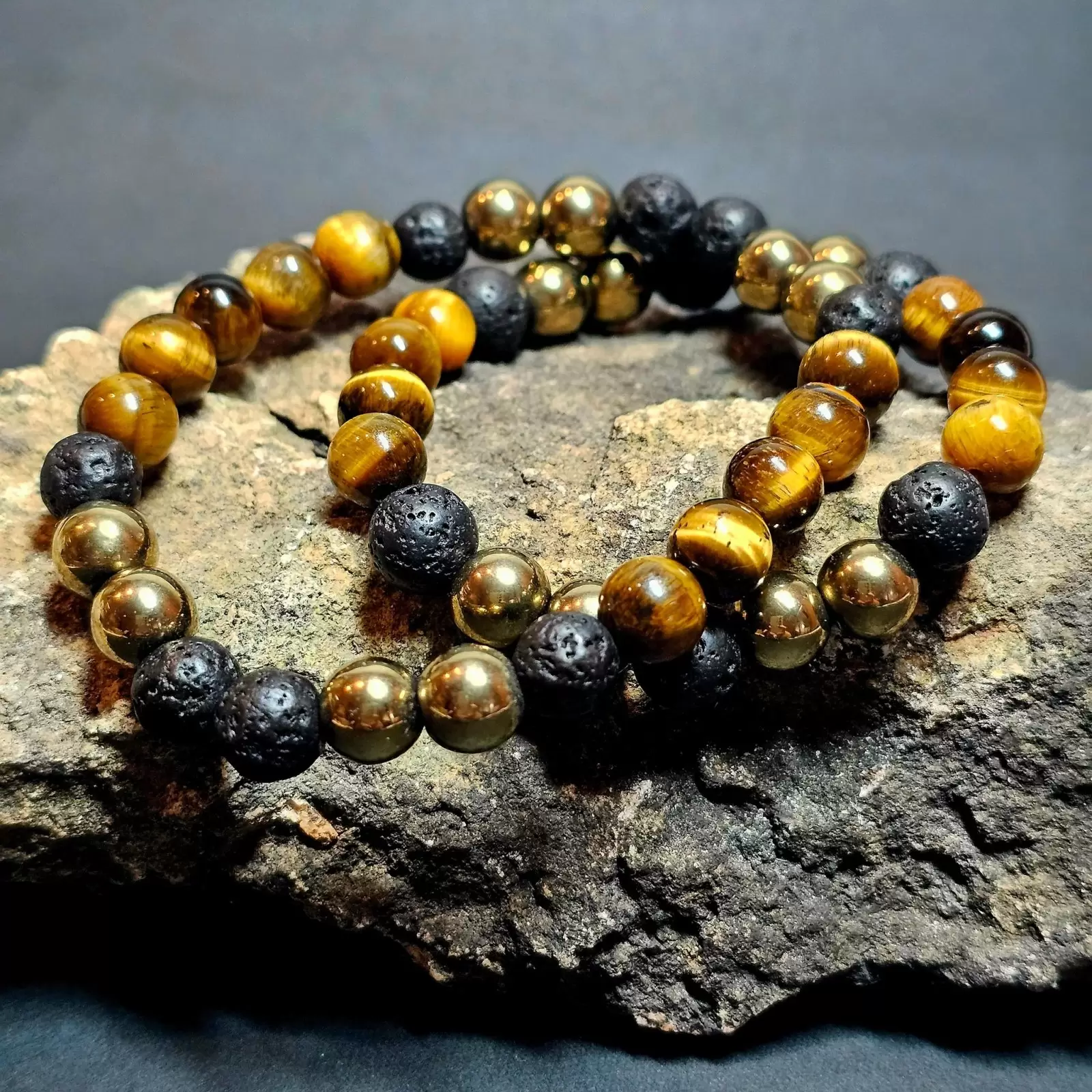 Ta spektakularna bransoletka została zaprojektowana z myślą o osobach pragnących podkreślić swój styl i osobowość lub po prostu chcących dopełnić outfit ciekawym, naturalnym dodatkiem. Powstała z 8mm kul lawy tygrysiego oka oraz hematytu platerowanego. Kamienie są nawleczone na gumkę jubilerską co sprawia, że jest wygodna w użytkowaniu, na co dzień :)