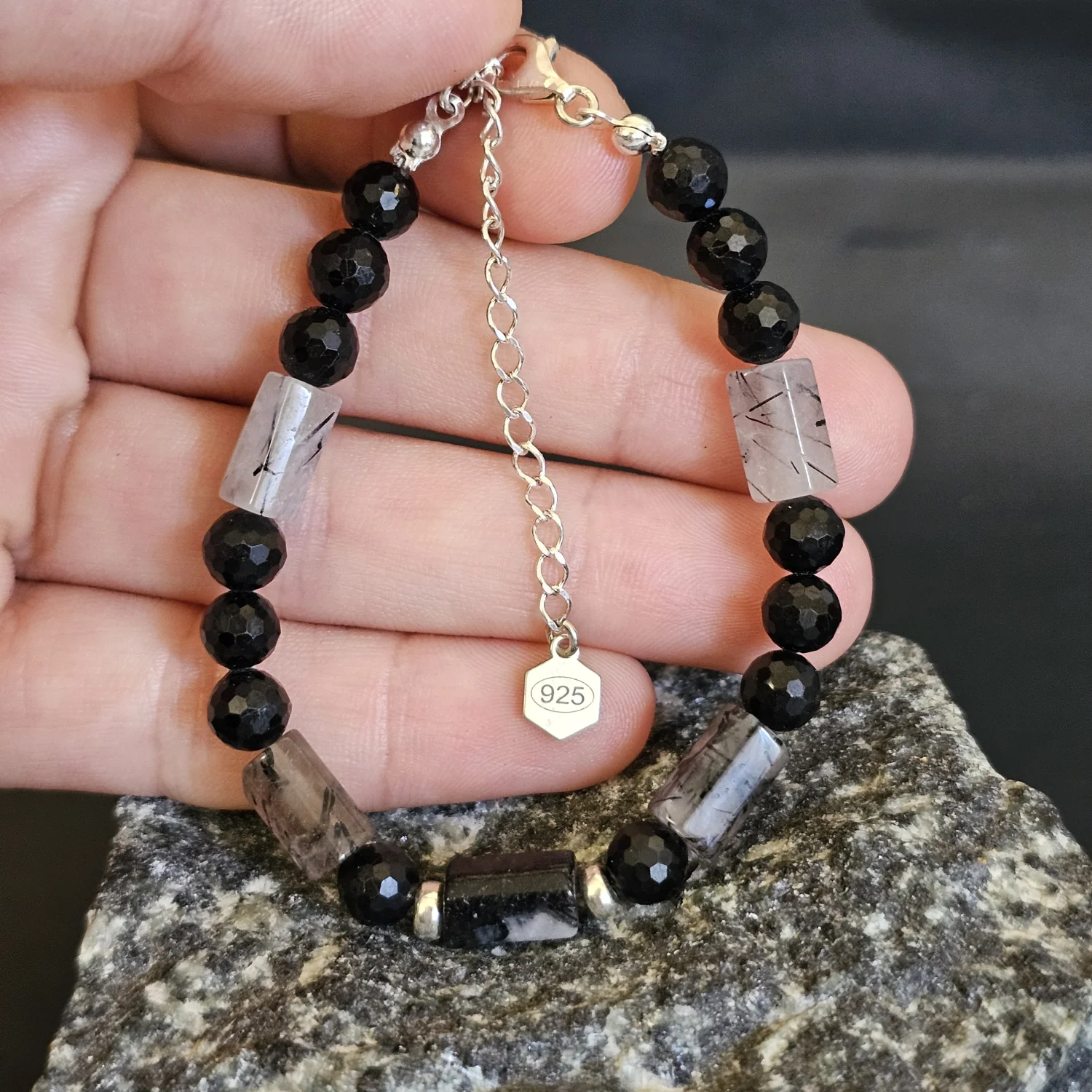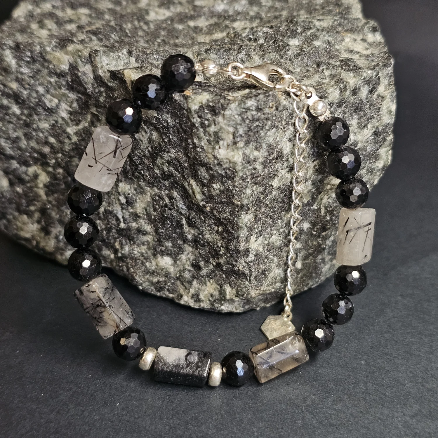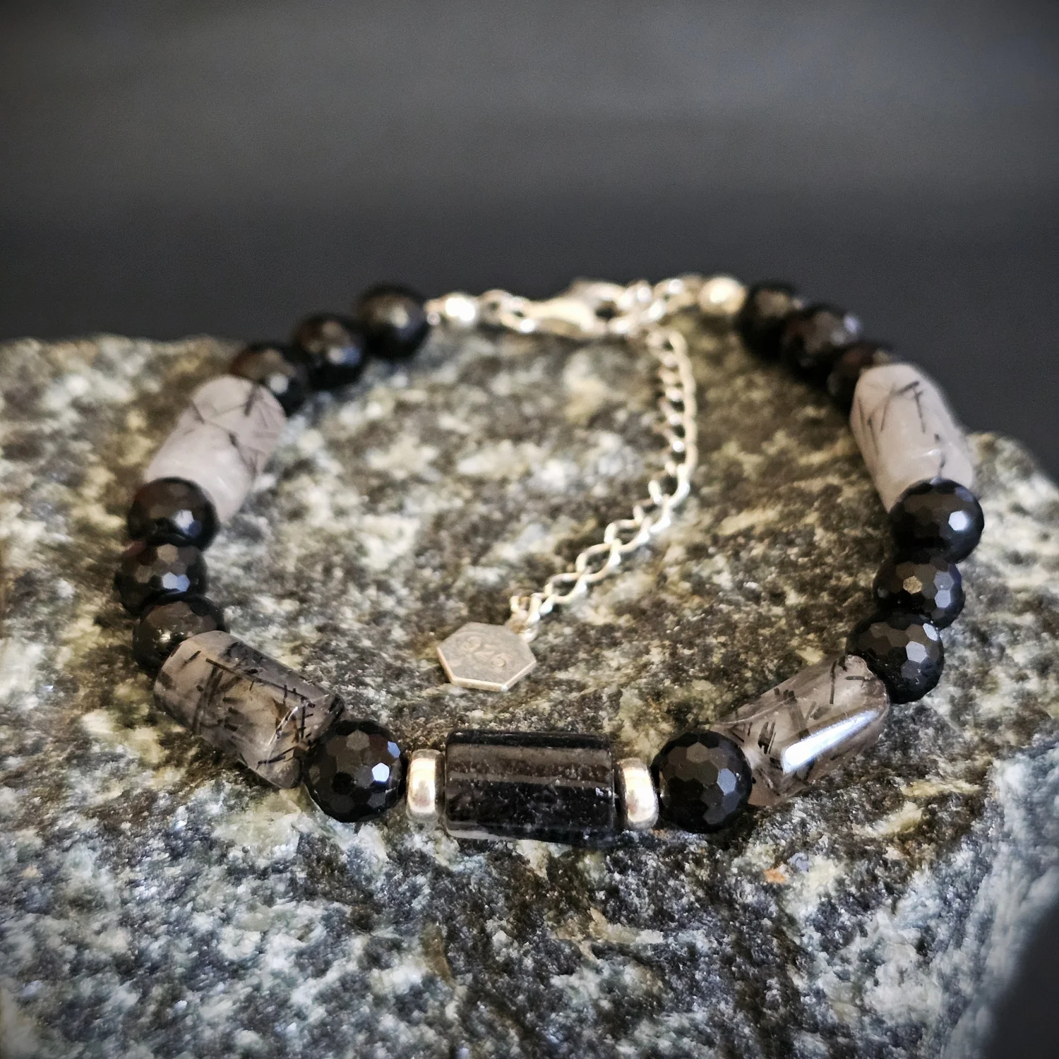 Bransoletkę tworzą fasetowane kulki czarnego turmalinu o średnicy 6 mm, mieniące się dyskretnym blaskiem dzięki delikatnemu szlifowi. Ich ciemny, nasycony kolor wprowadza nutę elegancji i siły. W centralnej części kompozycji uwagę przyciągają szlifowane walce z kwarcu z wrostkami turmalinu (10×6–7 mm) – kamienie o surowym, organicznym uroku, w których czarne igiełki turmalinu tworzą niepowtarzalne, naturalne wzory wewnątrz przejrzystej struktury kwarcu.