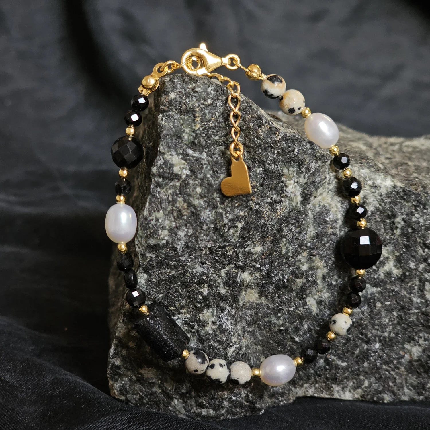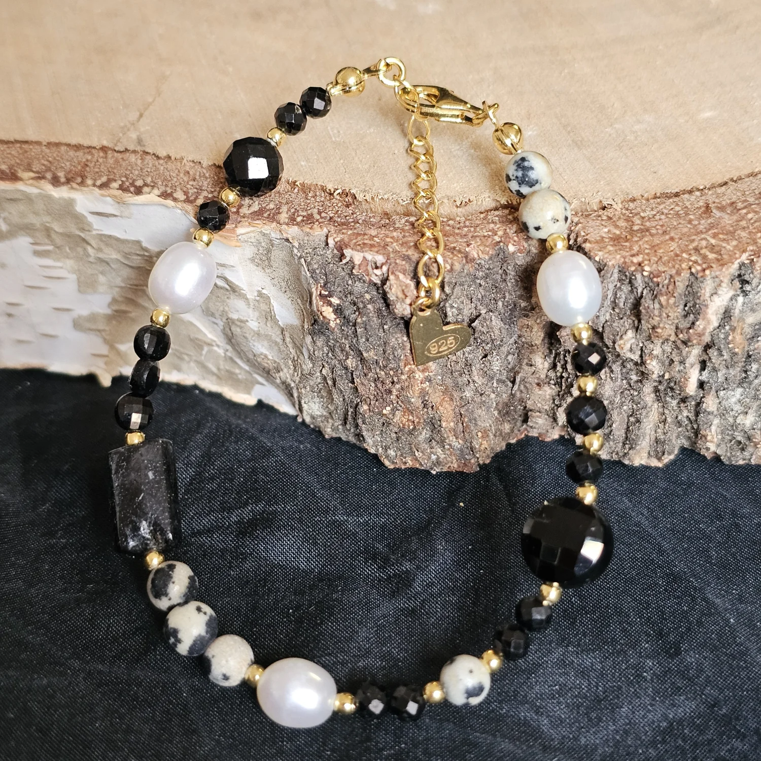 Bransoletka "SPOTTED ELEGANCE" (turmalin, perła naturalna, kwarc turmalinowy, jaspis dalmatyński)