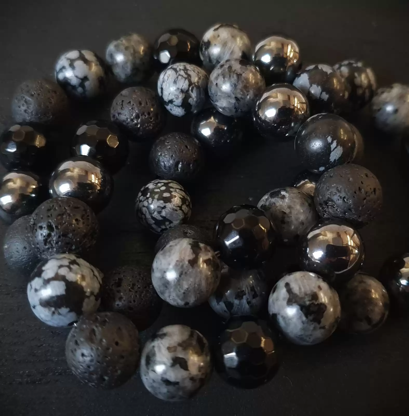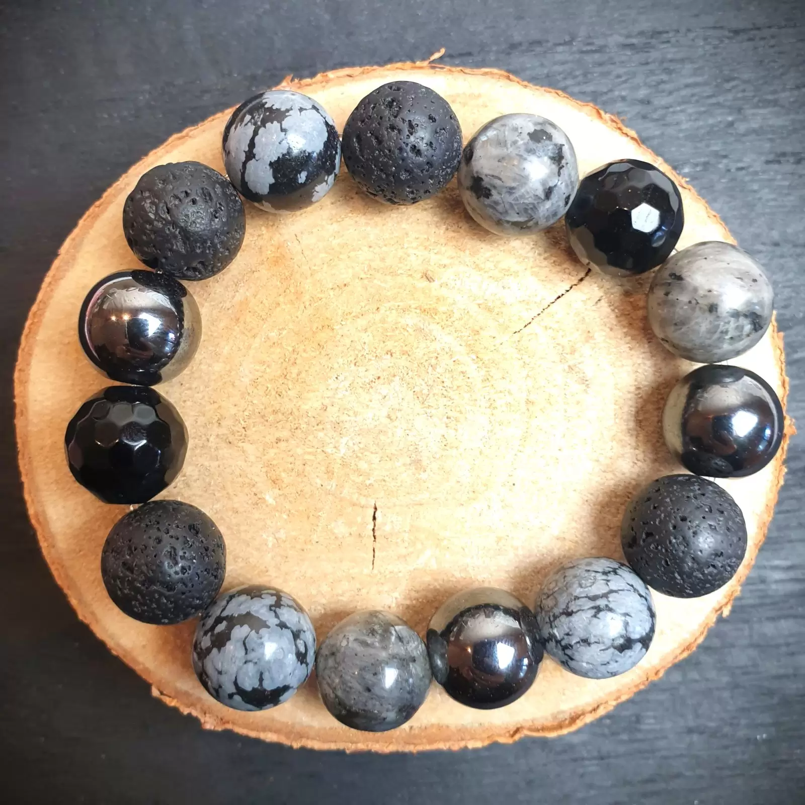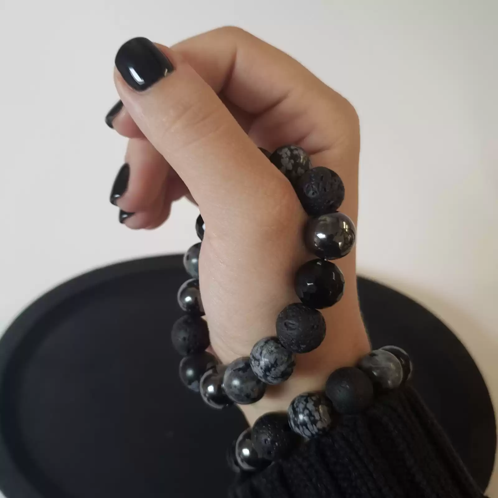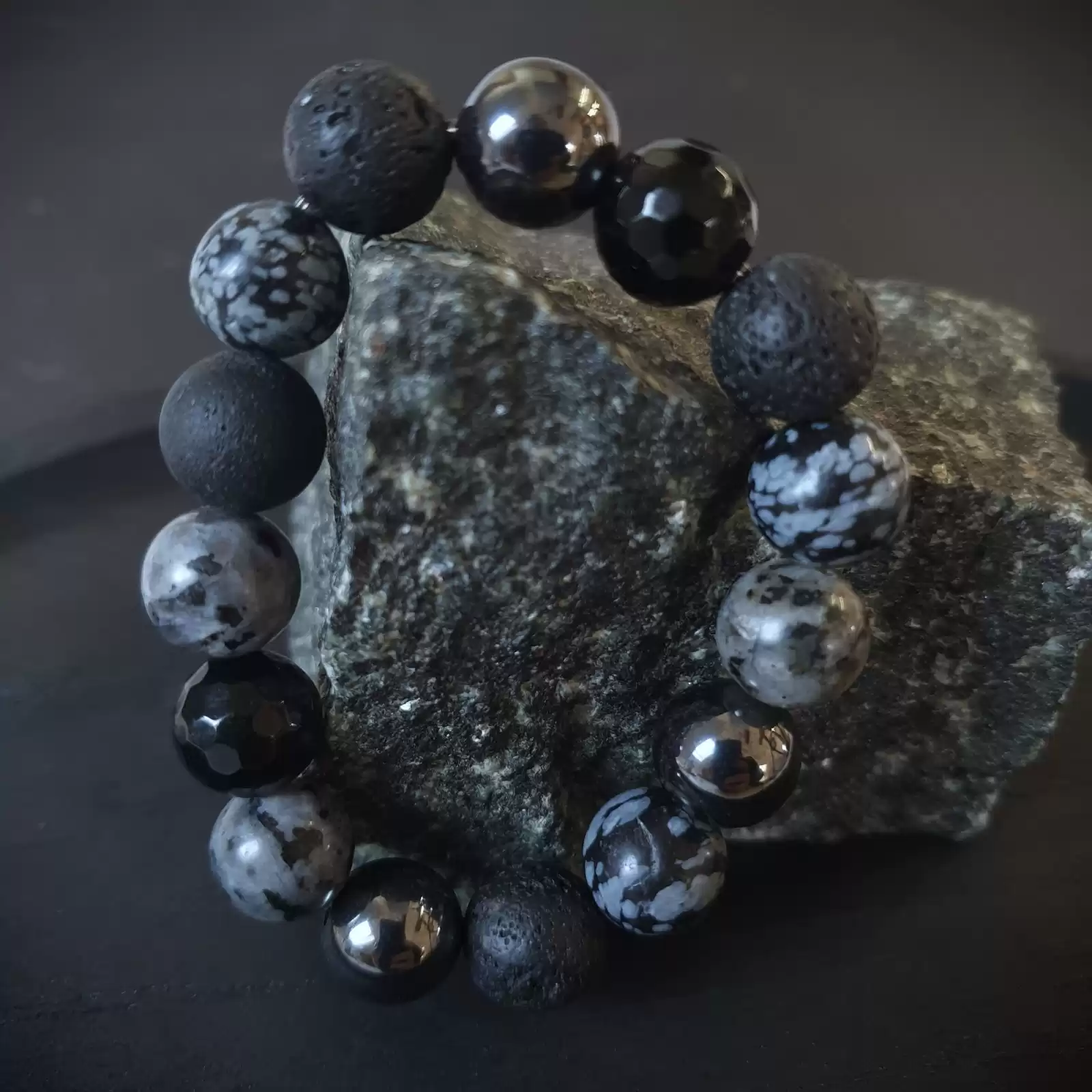 Ta wyjątkowa bransoletka została wykonana z różnych kamieni o średnicy 12mm na grubej, elastycznej gumce jubilerskiej. O jej unikatowości stanowi ciekawy, autorski układ elementów. Część bransoletki tworzy 12mm LAWA WULKANICZNA. Sposób w jaki powstaje oraz jej pochodzenie sprawiły, że ludzie zaczęli przypisywać jej specjalne właściwości. Surowe piękno tego kamienia przyciąga osoby ceniące naturę i pierwotny urok nieprzetworzonych darów ziemi. Ponadto lawa dzięki swojej porowatej powierzchni doskonale chłonie różnego typu olejki eteryczne i może być wykorzystywana przy aromaterapii. W tym modelu pojawia się też popularny, efektowny HEMATYT. W starożytności uznawany za Kamień Wojowników. Reprezentuje trwałość, siłę, trzymanie się zasad, poświęcenie, ale też atrakcyjność i osiąganie zamierzonych celów. Fasetowany, czarny ONYKS powstaje w pogazowych pustkach w skałach wulkanicznych. Jest cenionym kamieniem jubilerskim, ponadczasowym i pełnym klasy. Istnieje przekonanie, że kamień ten przynosi szczęście. Bardzo interesującym i przyciągającym wzrok kamieniem w tej bransoletce jest OBSYDIAN ŚNIEŻNY. Posiada liczne białe krystality układające się w kształt płatków śniegu lub kwiatów.