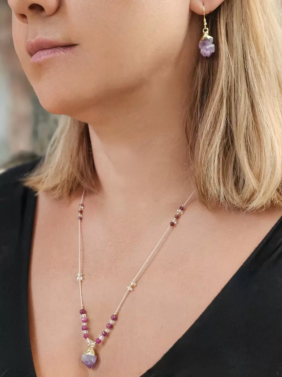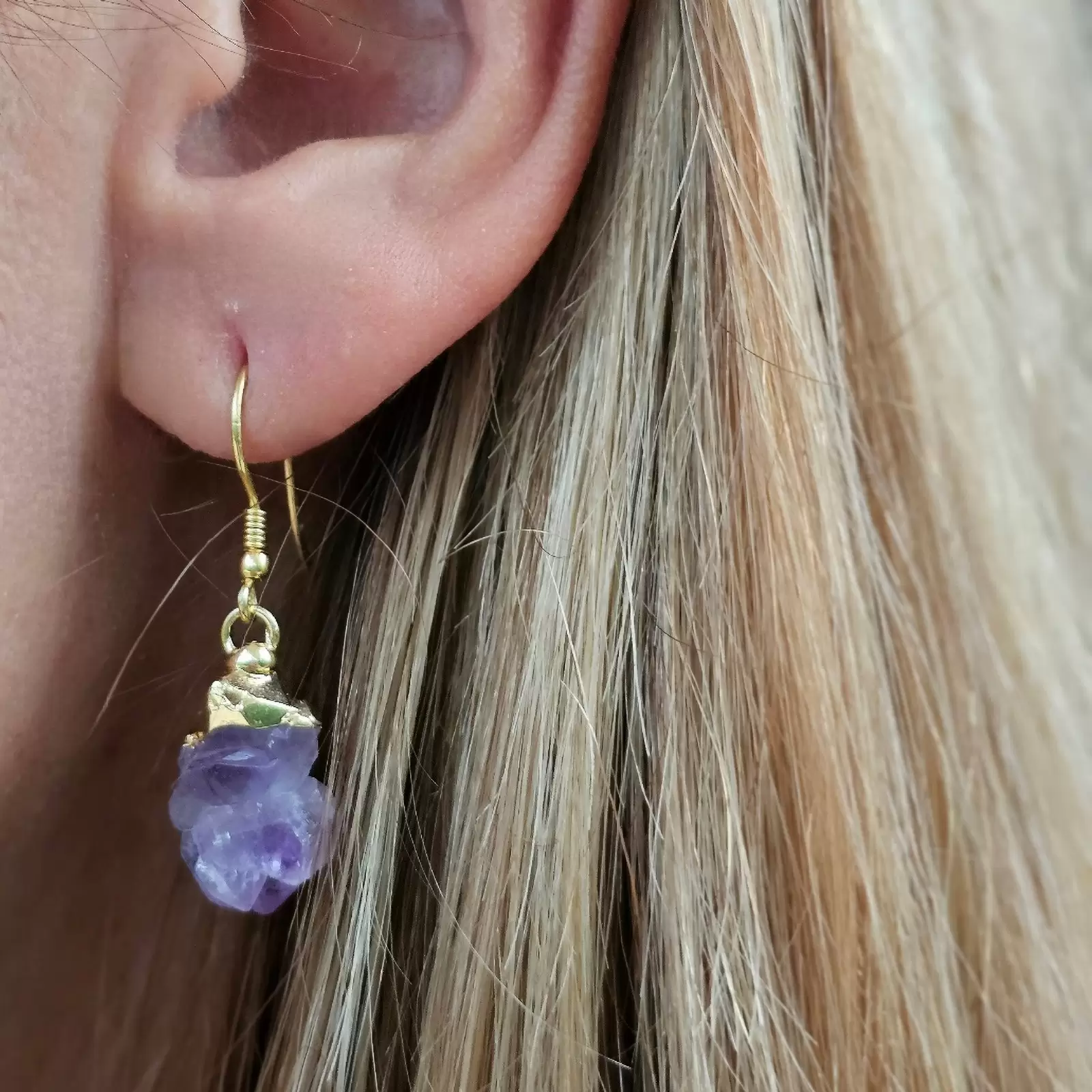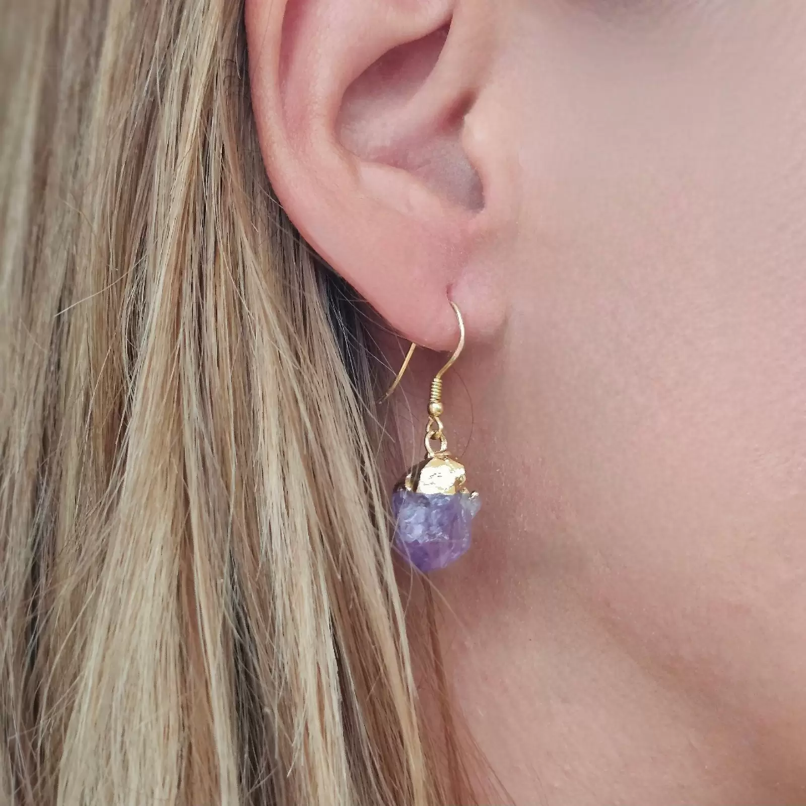Kolczyki wykonane są z surowych, naturalnych bryłek niebieskiego AMETYSTU o wymiarze ok. 1,5x1-1,5cm z czapeczkami w kolorze złotym. Podwieszone są one na biglach otwartych wykonanych ze srebra pr. 925 platerowanego 24k. złotem. Długość kolczyków jest niewielka i na pewno nie będzie przeszkadzała w pędzie życia i czynnościach codziennych ;)