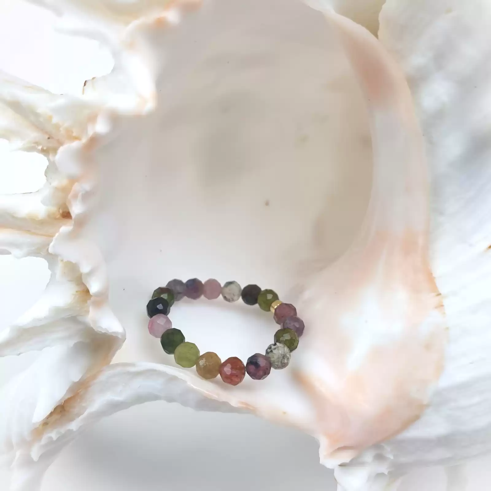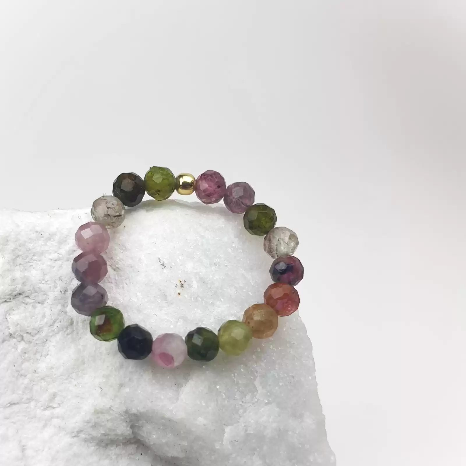 Pierścionek elastyczny powstał z kolorowych fasetowanych 3mm kul TURMALINU. Kuleczka, przekładka o średnicy 2mm wykonana jest ze srebra próby 925 złoconego 24k. złotem.