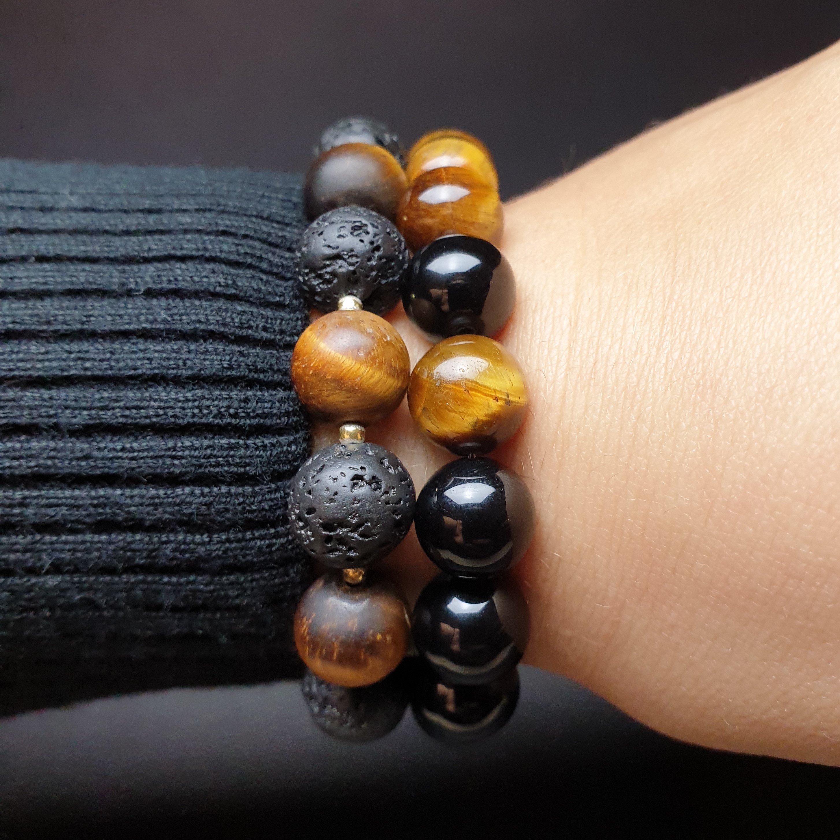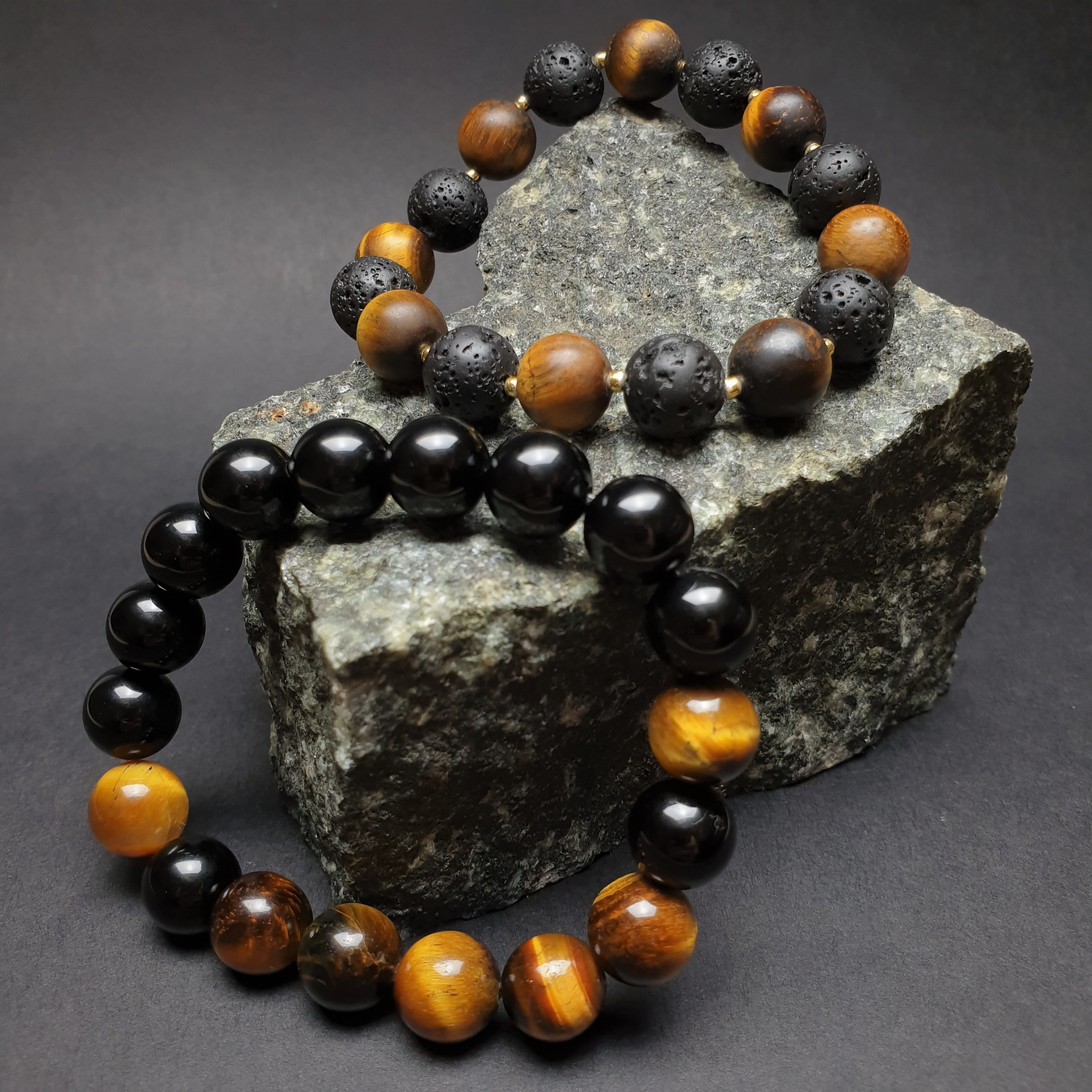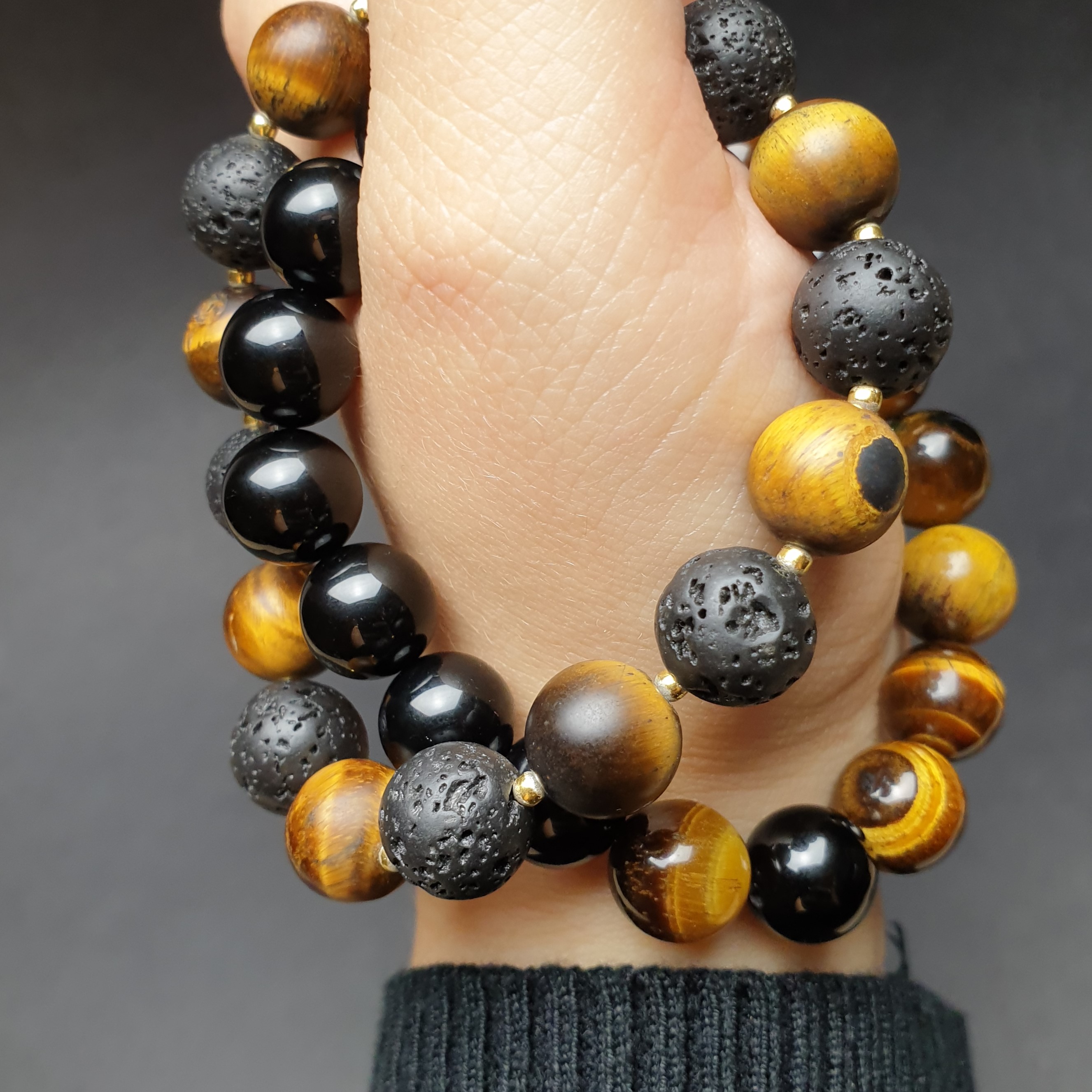 Ta wyjątkowa bransoletka została wykonana z kamieni naturalnych o średnicy 10mm na elastycznej gumce jubilerskiej. O jej unikatowości stanowi niesztampowy, autorski układ elementów i harmonijne zestawienie kolorów. Znaczną część bransoletki „EYE OF THE TIGER” stanowią kule z wyjątkowej odmiany kwarcu zwanej TYGRYSIM OKIEM. Ten popularny i lubiany minerał zawdzięcza swoją nazwę charakterystycznemu zjawisku optycznemu jakie zachodzi podczas zmiany położenia kamienia. Najlepiej można je zaobserwować na wypolerowanej oświetlonej powierzchni. Resztę bransoletki uzupełniają gładkie, błyszczące kule czarnego ONYKSU. Powstaje on w skałach pochodzenia wulkanicznego jest cenionym kamieniem jubilerskim, ponadczasowym, pełnym klasy i wdzięku.